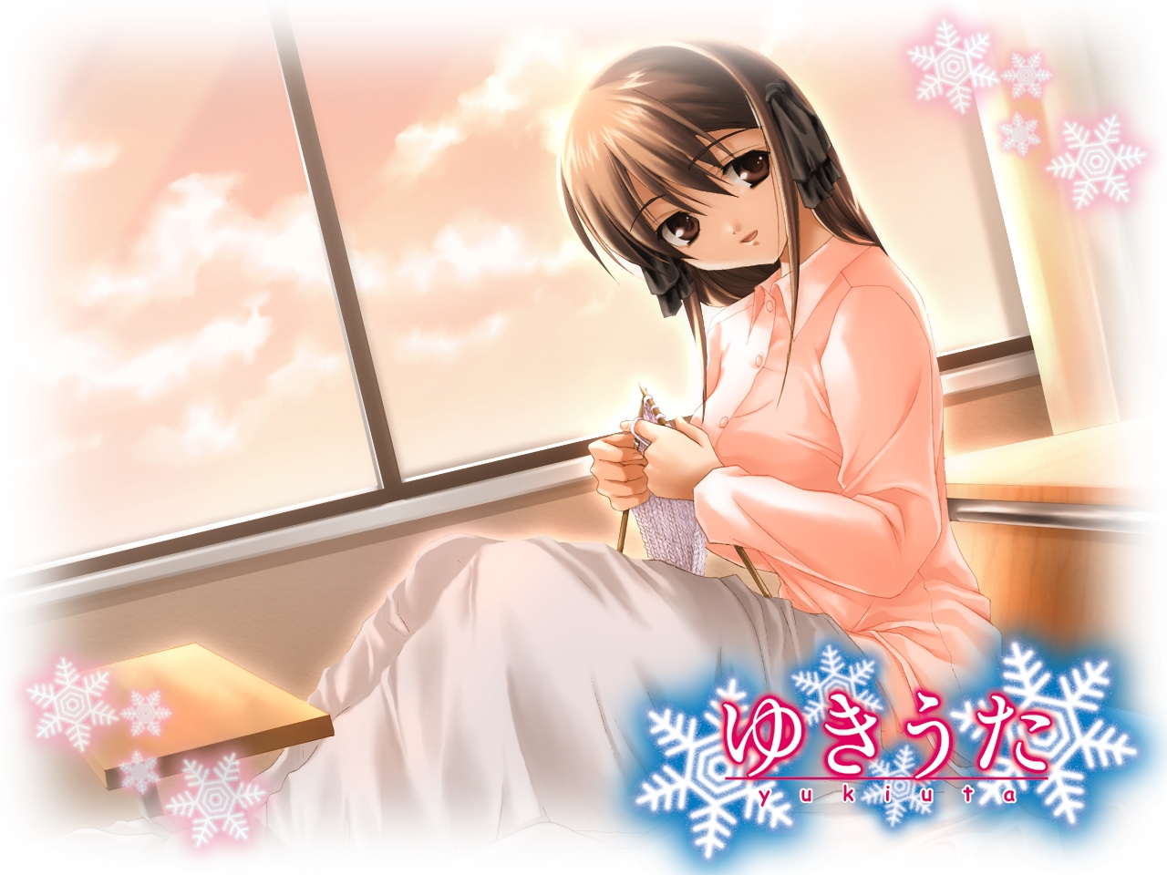 Description: A woman sitting on a window sill in front of a window with snowflakes on it and a sky background.