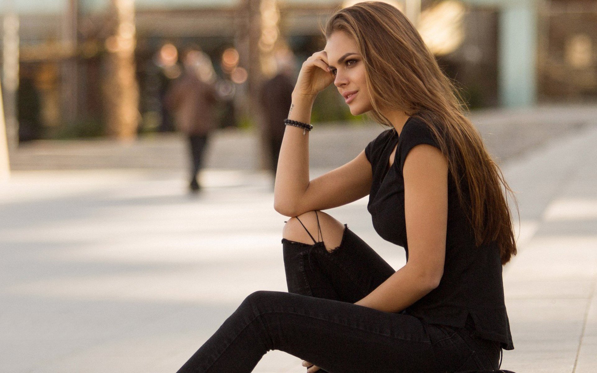 Description: A woman sitting on the ground with her hand on her head and her hand on her head.