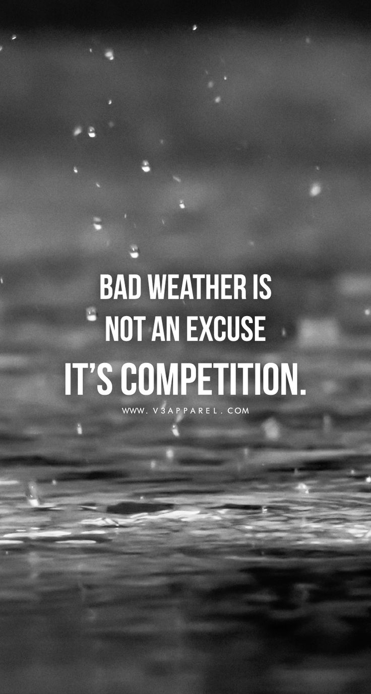 Description: A black and white photo with a quote on it saying bad weather is not an exercise it's competition.