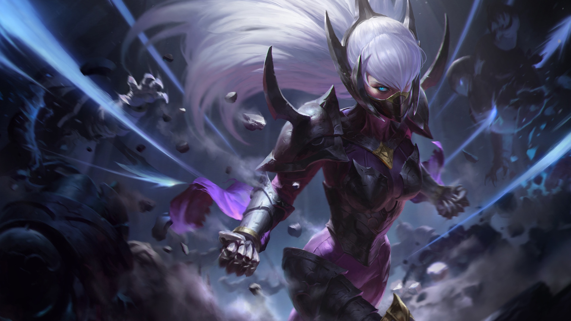 Description: A character from the game league of league of warcraft holding a sword and a sword in his hand.