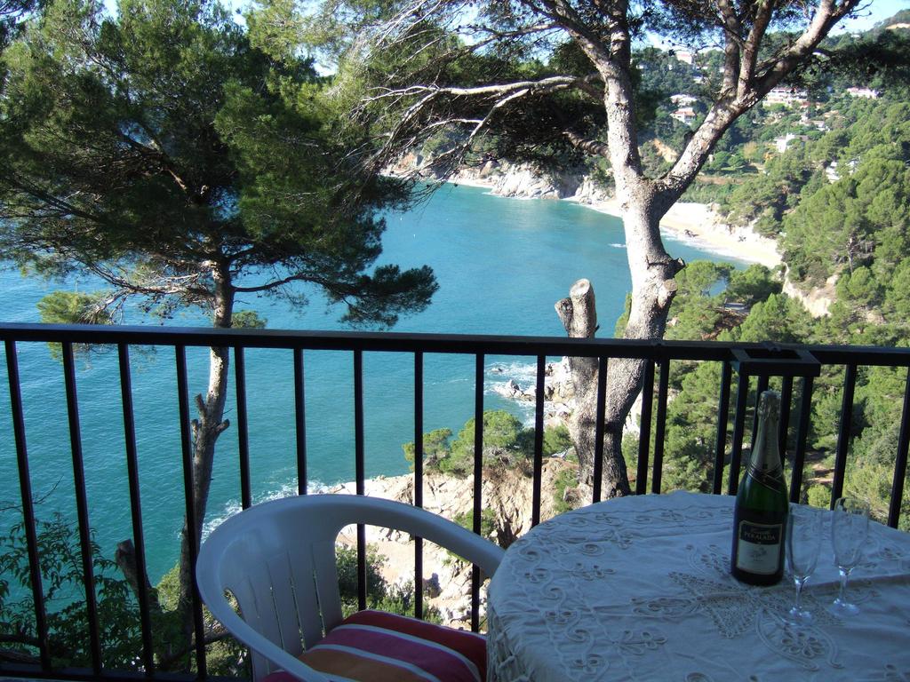 Description: A table and chairs on a balcony overlooking a body of water and trees with a bottle of wine on the table.