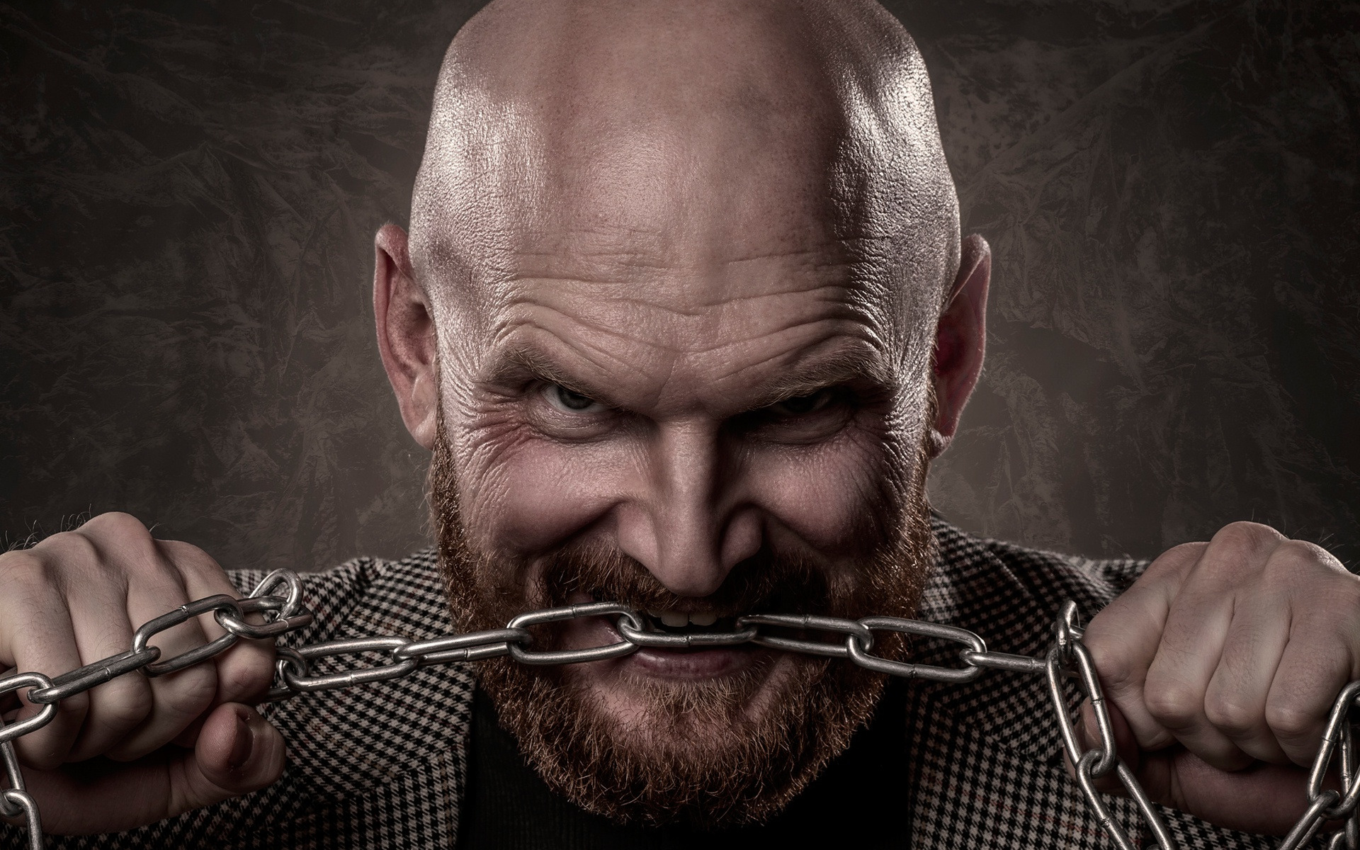 Description: A man with a bald head and a beard is holding a chain around his neck and looking at the camera.