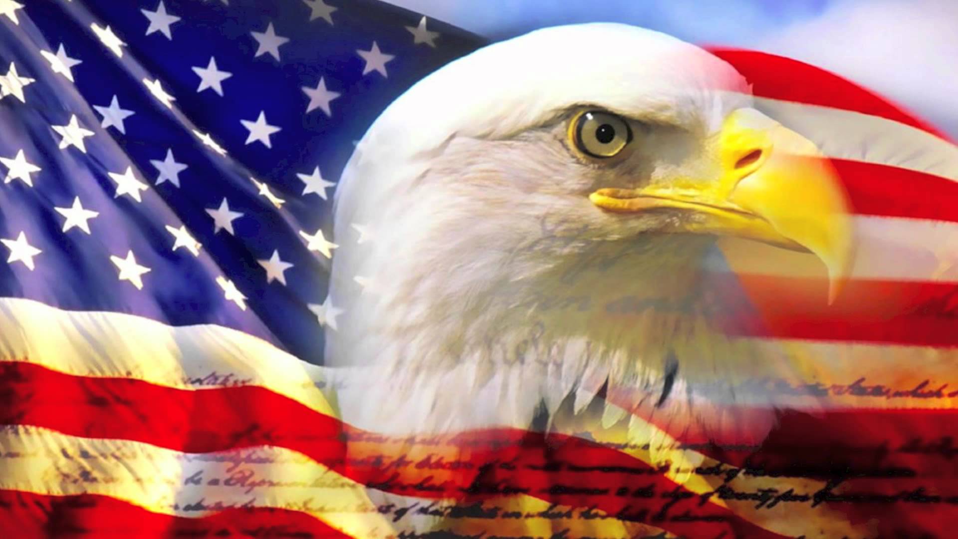 Description: A bald eagle with a flag in the background of it's image.
