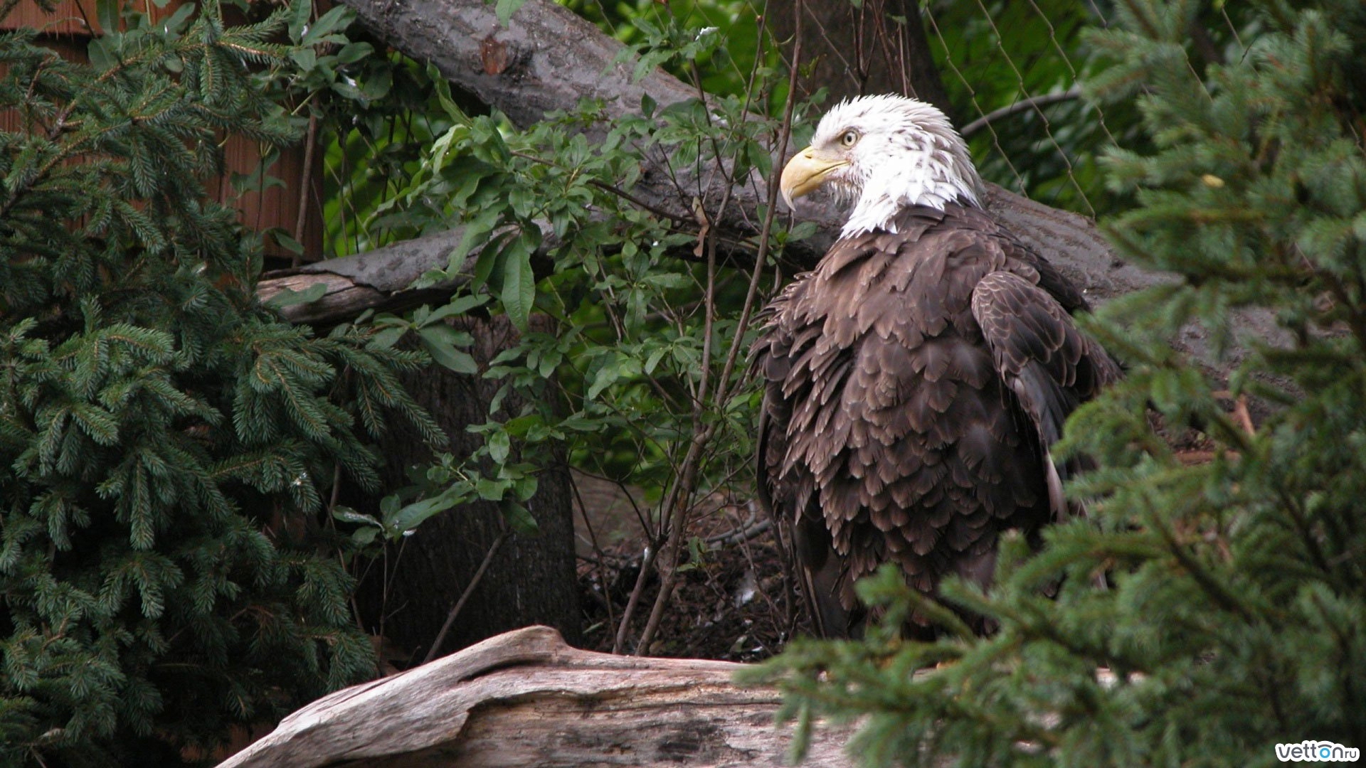 Description: A bald eagle sitting in a tree filled forest next to a fallen tree trunk and a log in the foreground.