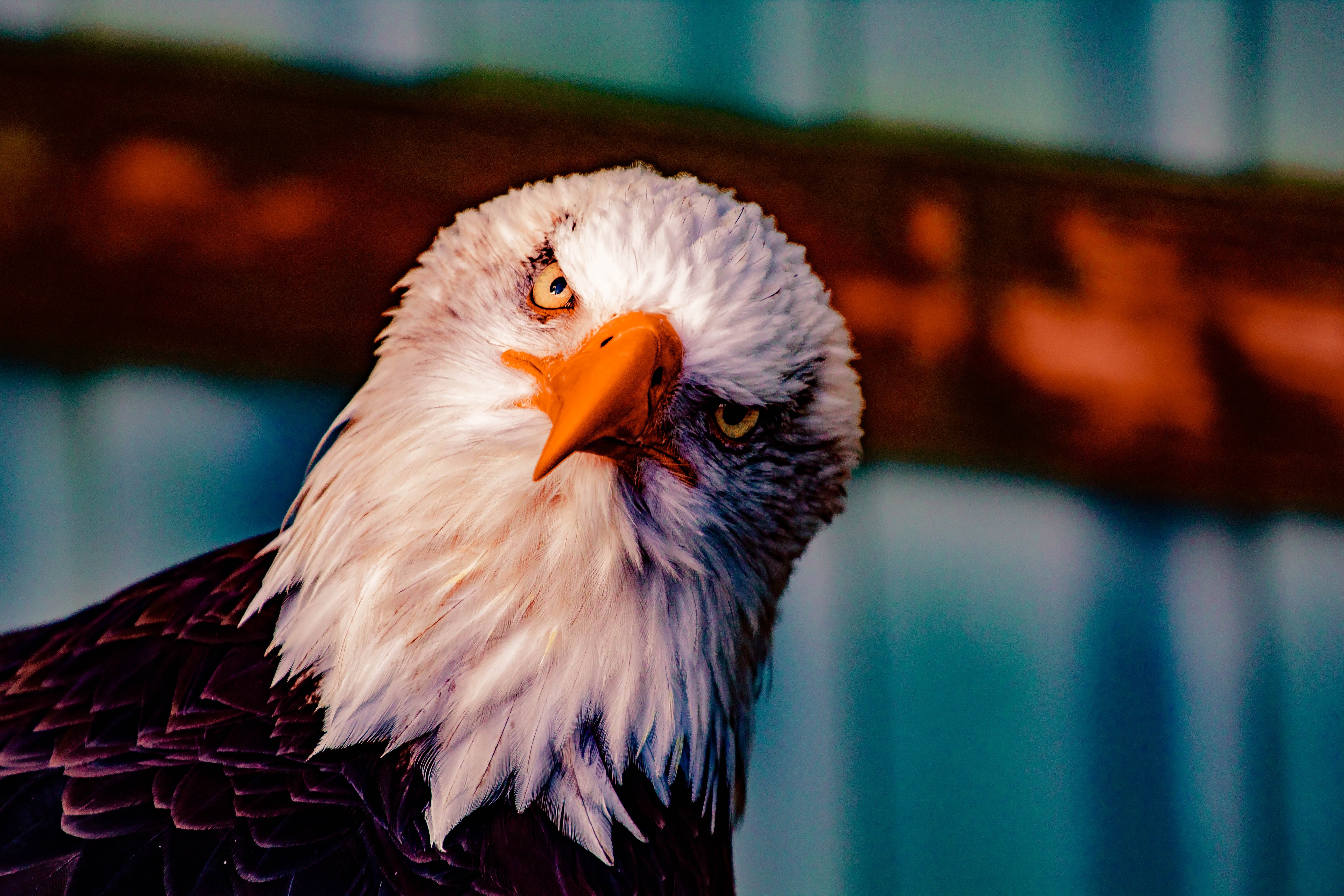 Description: A bald eagle with a red beak and white head and a blue background with a rusted metal bar.