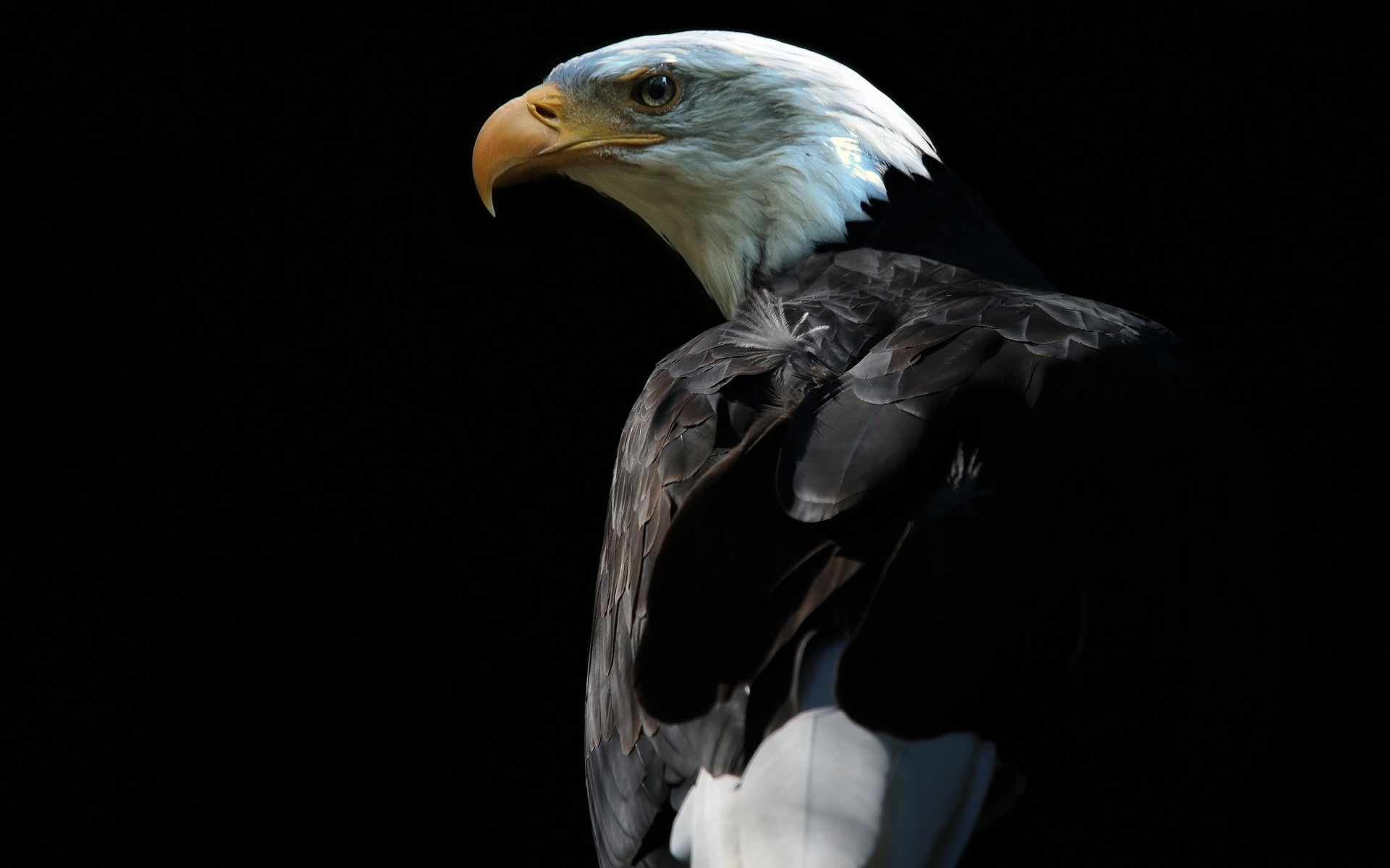 Description: A bald eagle with a white head and black wings.