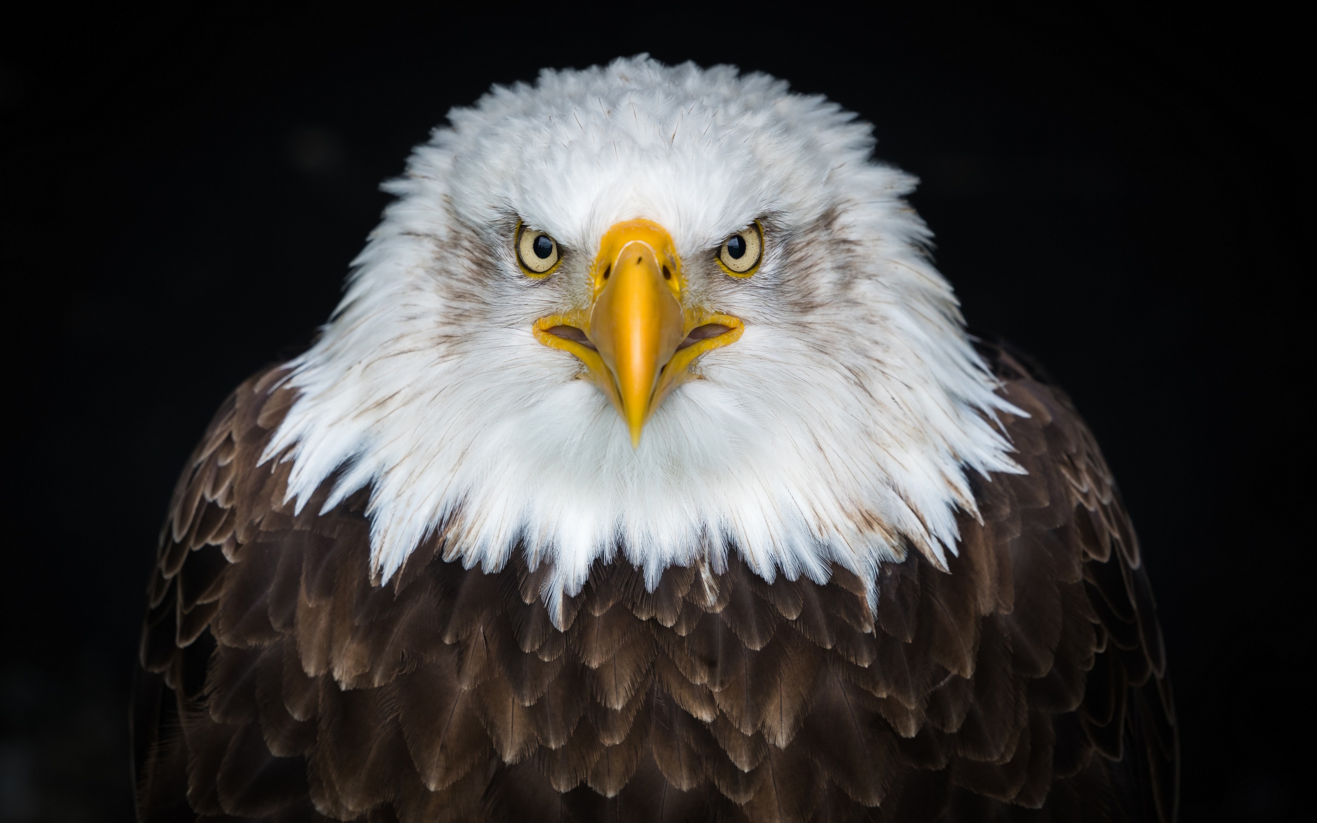 Description: A bald eagle with a white head and yellow beak is looking at the camera with a black background and a black background.