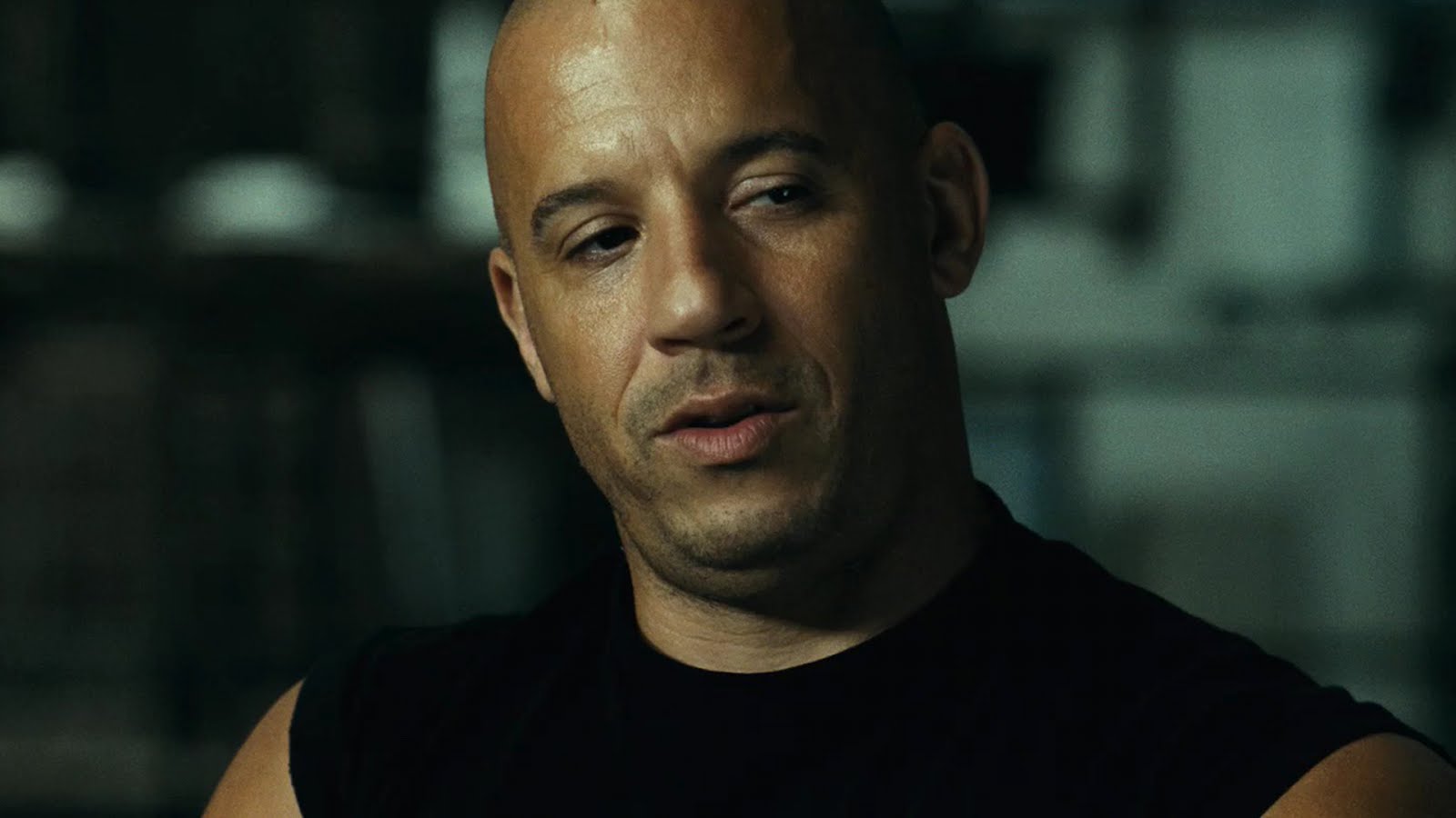 Description: A bald man in a black shirt looking at the camera with a serious look on his face and chest.