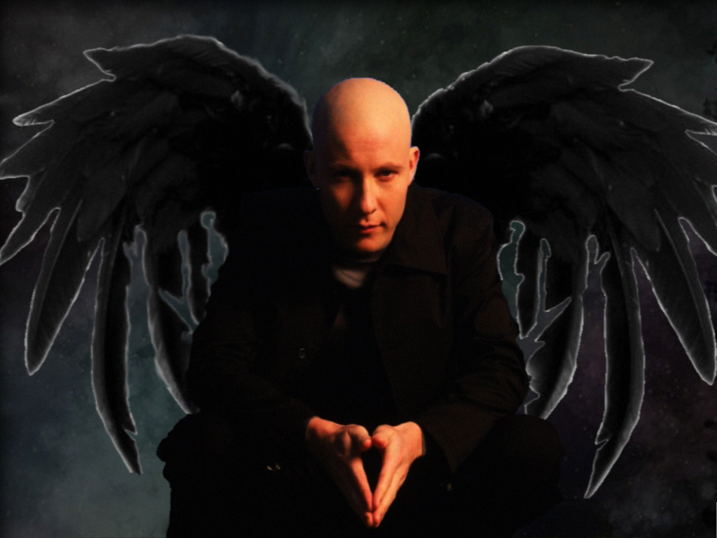 Description: A bald man with black wings sitting down with his hands in the air and his hands folded out in front of him.