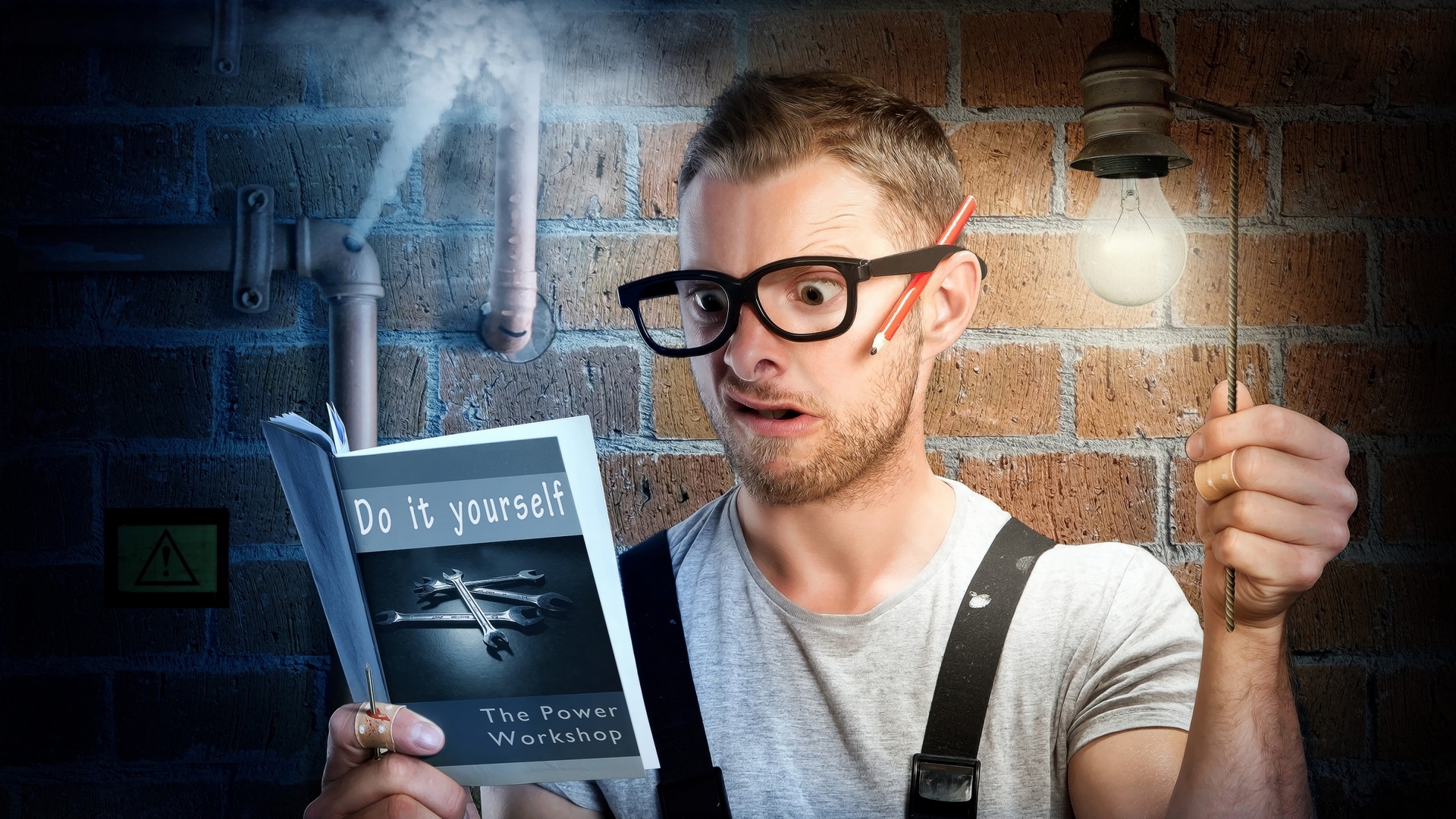Description: A man holding a book and a light bulb in his hand with a book in front of him and a brick wall behind him.