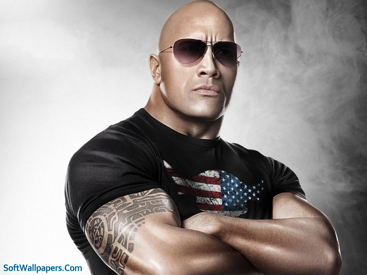 Description: A man with a bald head and sunglasses on posing for a picture with his arms crossed and his arms crossed.