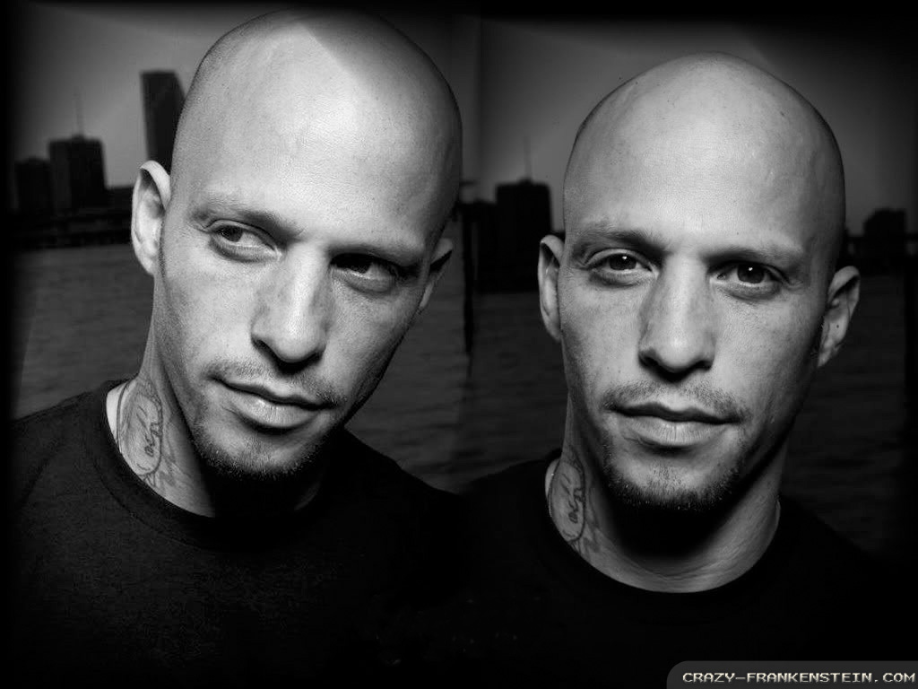 Description: Two men with bald heads are looking at the camera with a city in the background and a lake in the foreground.