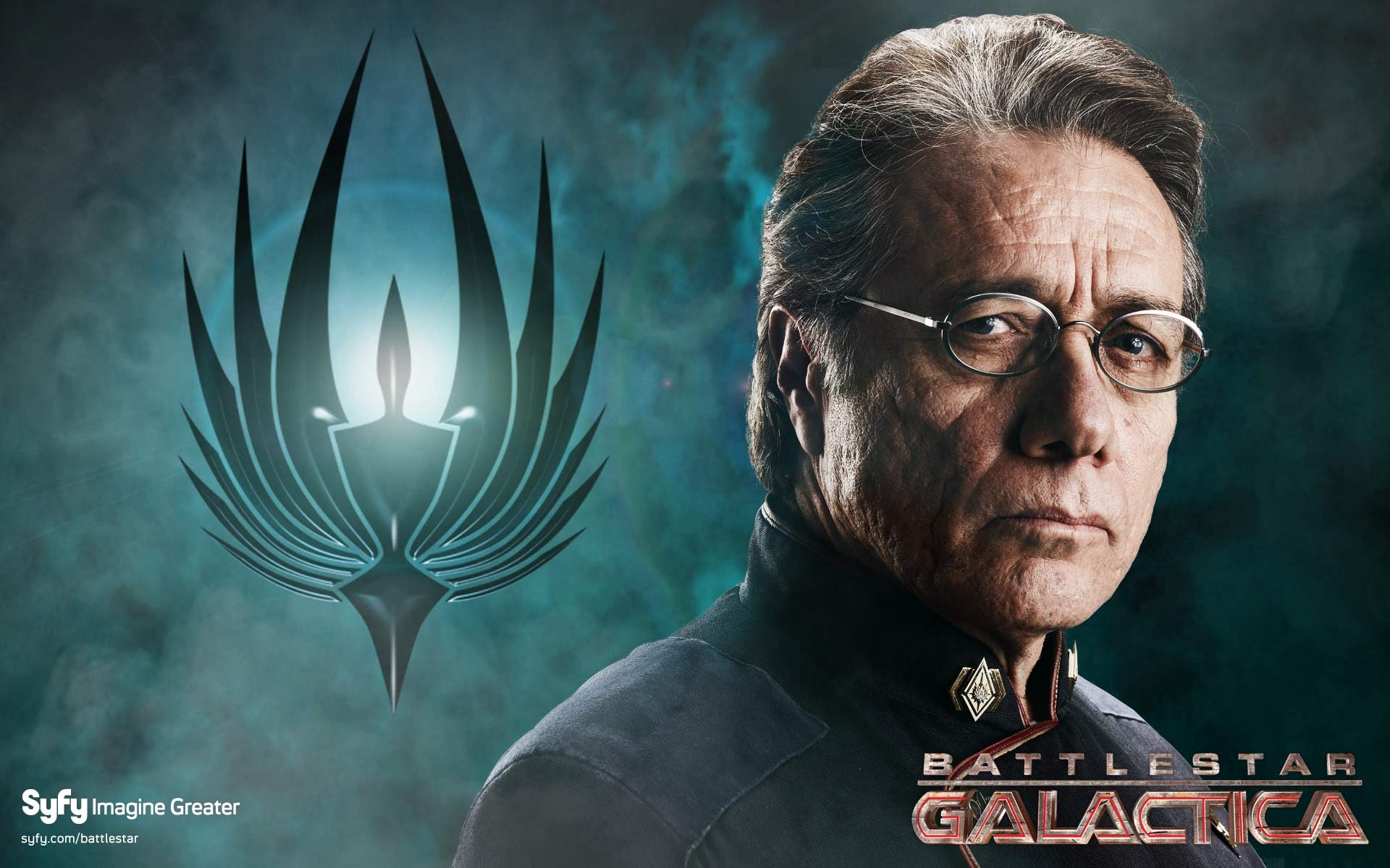 Description: A man in glasses and a black shirt with a bird on it's head and a logo of the movie battlestar galactic.