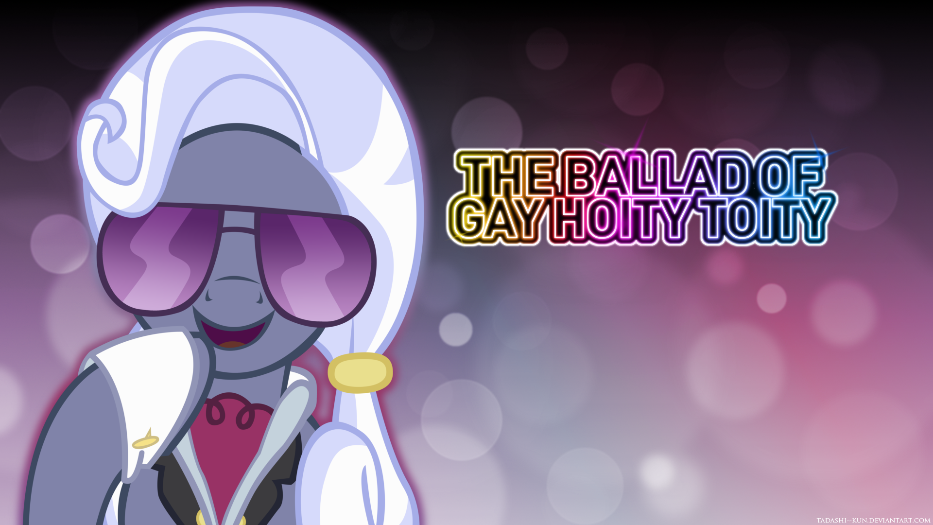 Description: A cartoon character with a pink hat and sunglasses on and a purple background with the words the ballade gayty.