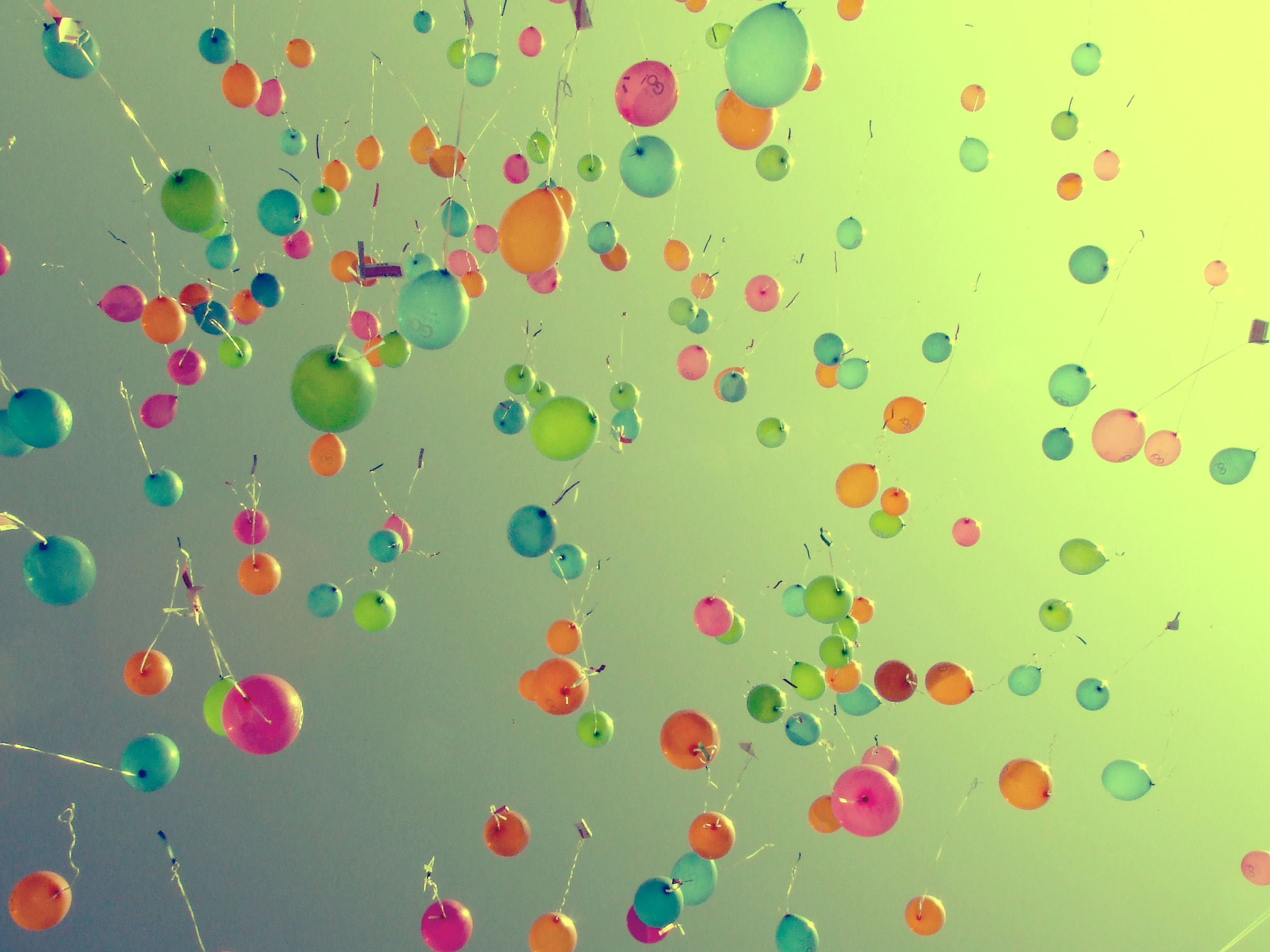Description: A bunch of balloons are flying in the sky together with a kite in the background that is a bit blurry.