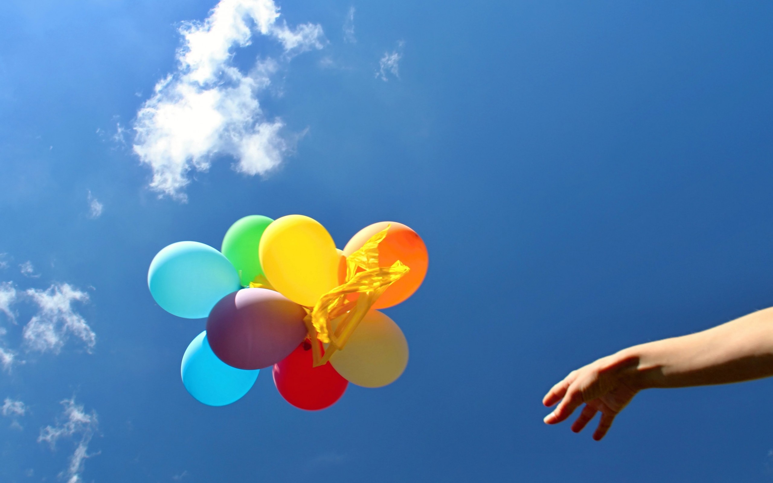 Description: A person is flying a bunch of balloons in the sky with a kite in the air behind them and a hand reaching for the balloon.