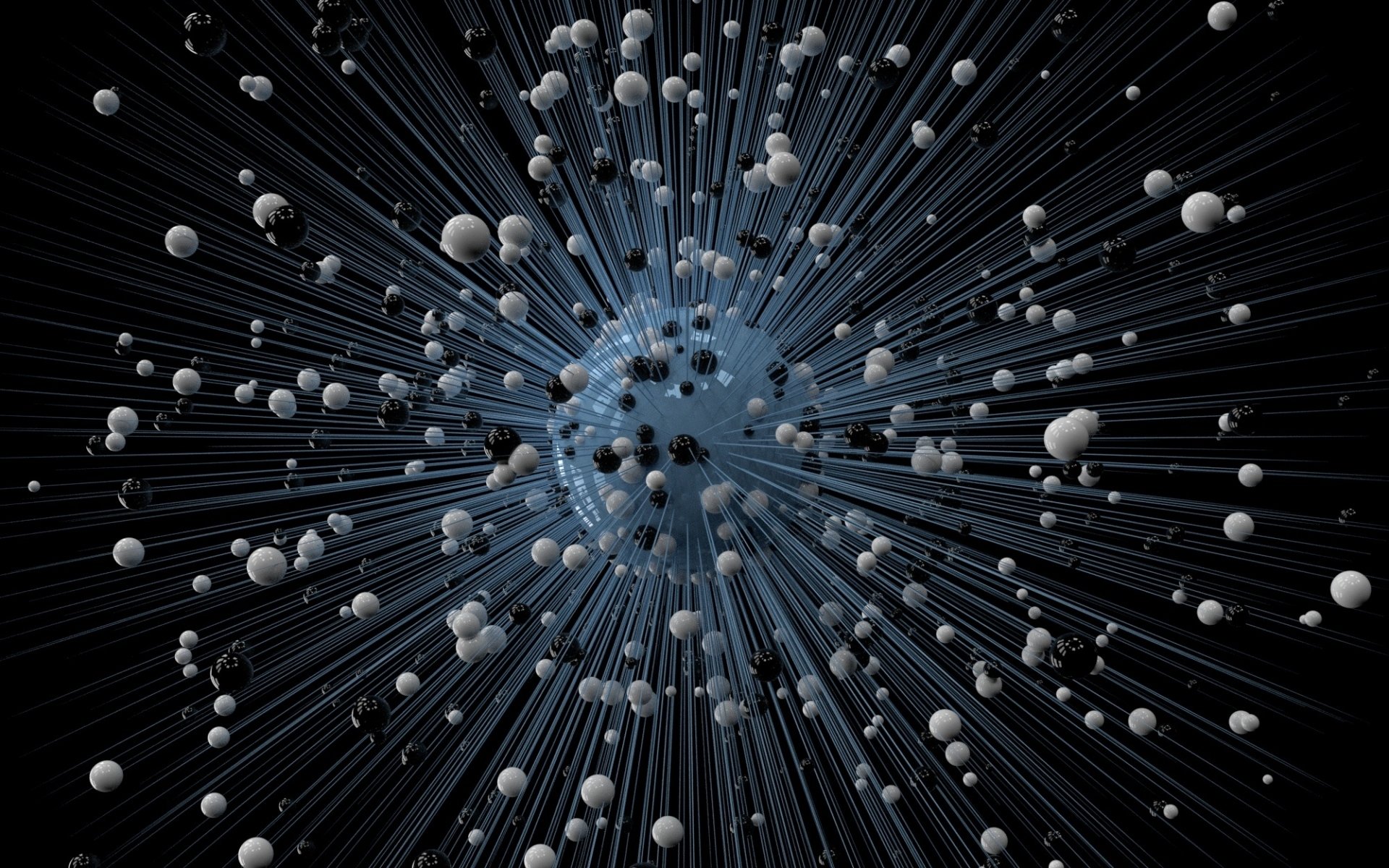 Description: A bunch of balls are in the middle of a black background with a blue center and white dots in the middle.