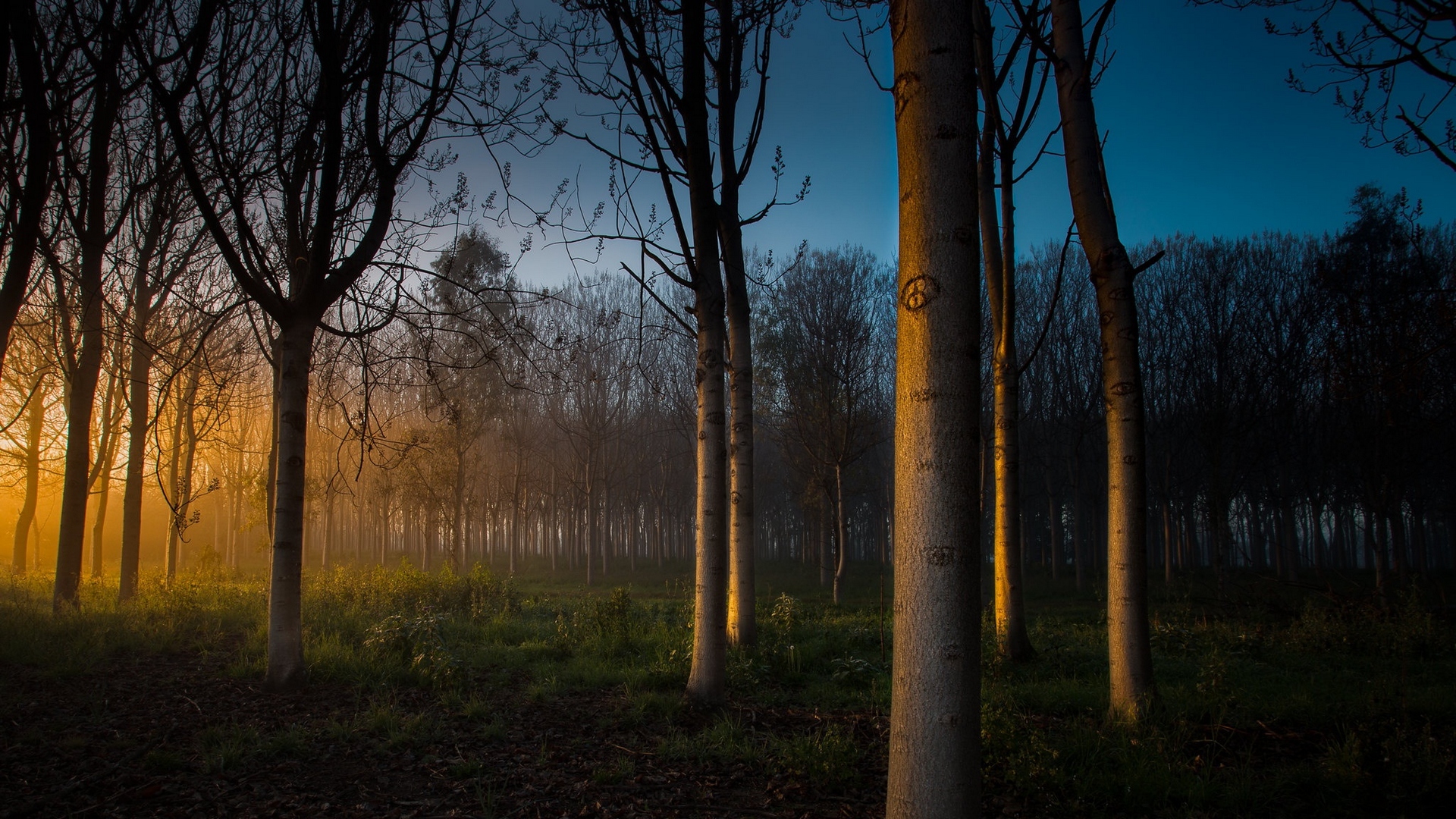 Description: A forest with a lot of trees and a sun setting in the background with fog in the air and a few trees in the foreground.