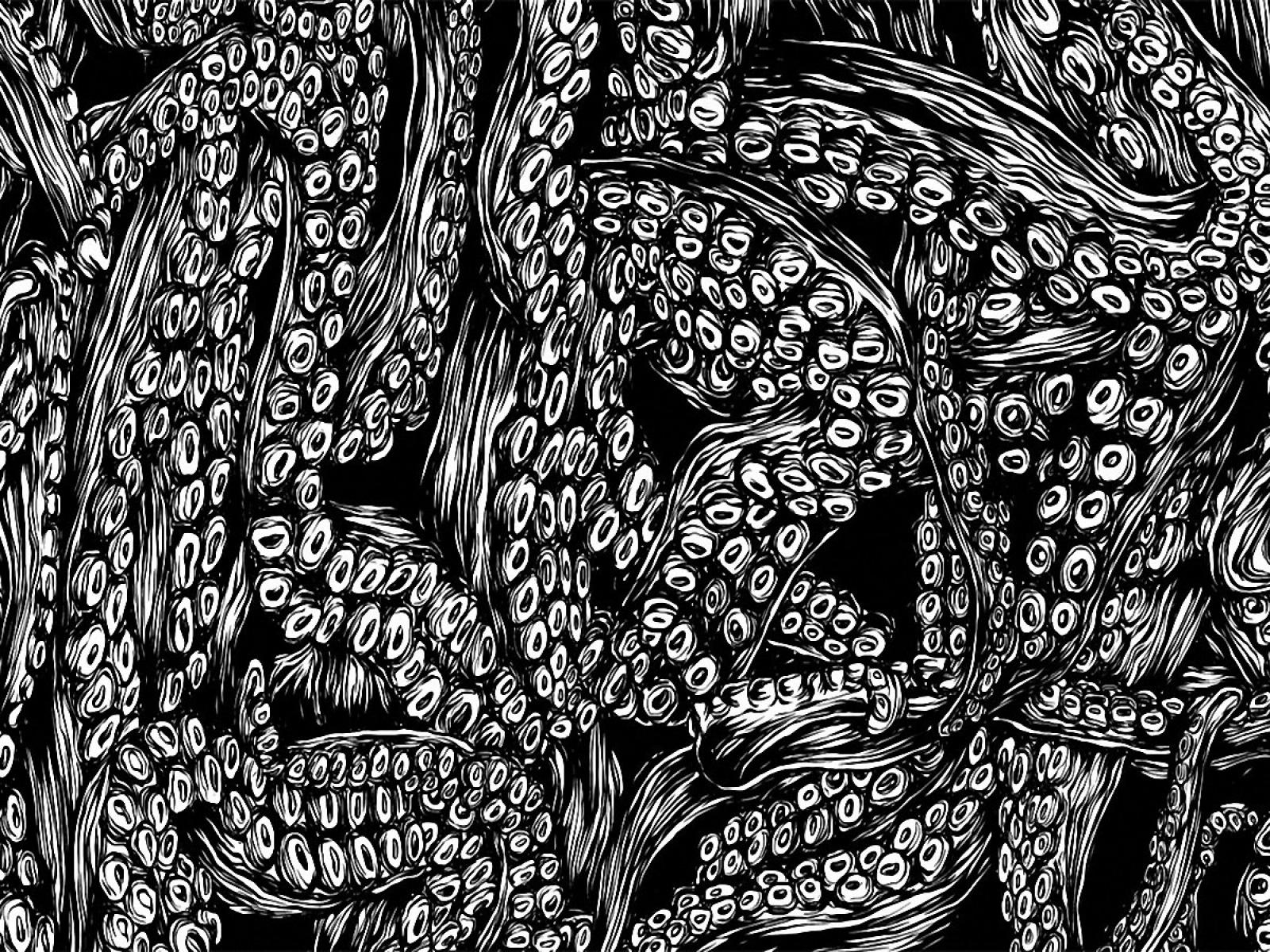 Description: A black and white drawing of a bunch of bananas on a table top with a black background and a white and black pattern.