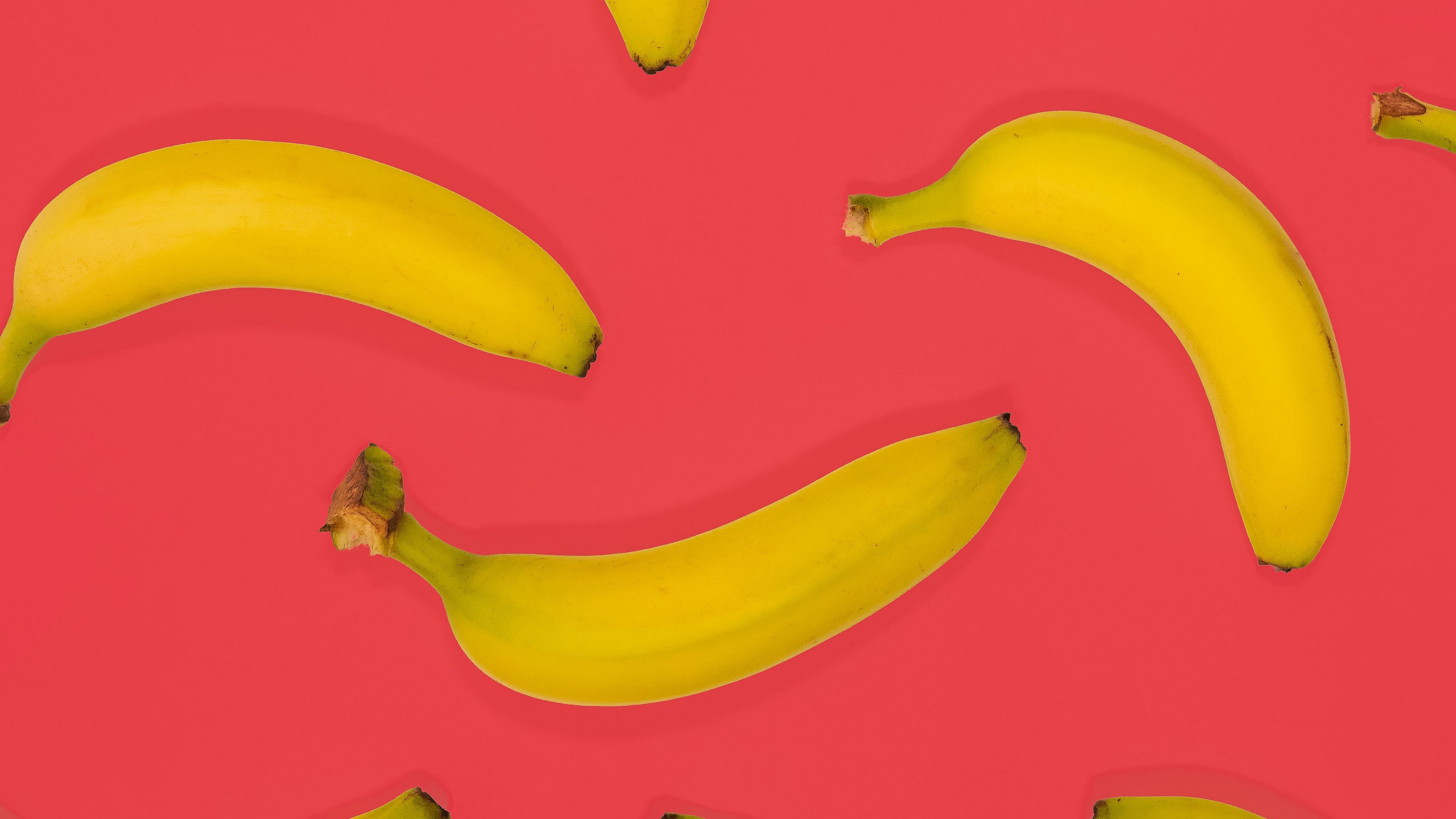 Description: A group of bananas sitting on top of a pink surface with a red background behind them and a few bananas in the middle.