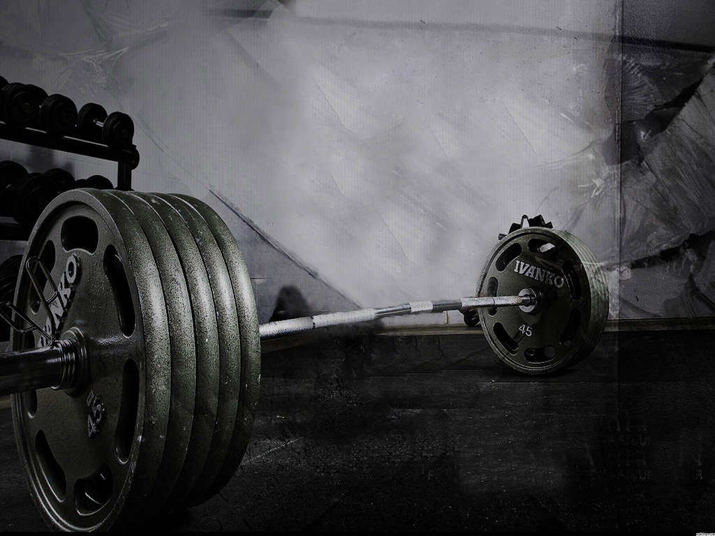 Description: A barbell with a weight plate on the ground in a gym room with a wall painted in black and white.