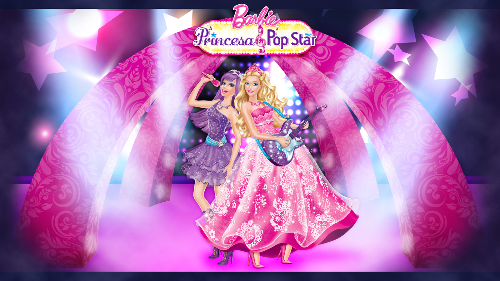 Description: A barbie doll is standing on a stage with a pink dress and tiara on her head and a pink bag.