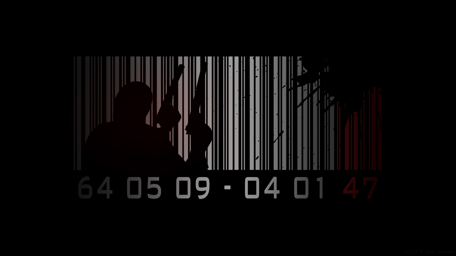 Description: A barcode with a silhouette of a man holding a gun in it's hand and a red and black background.