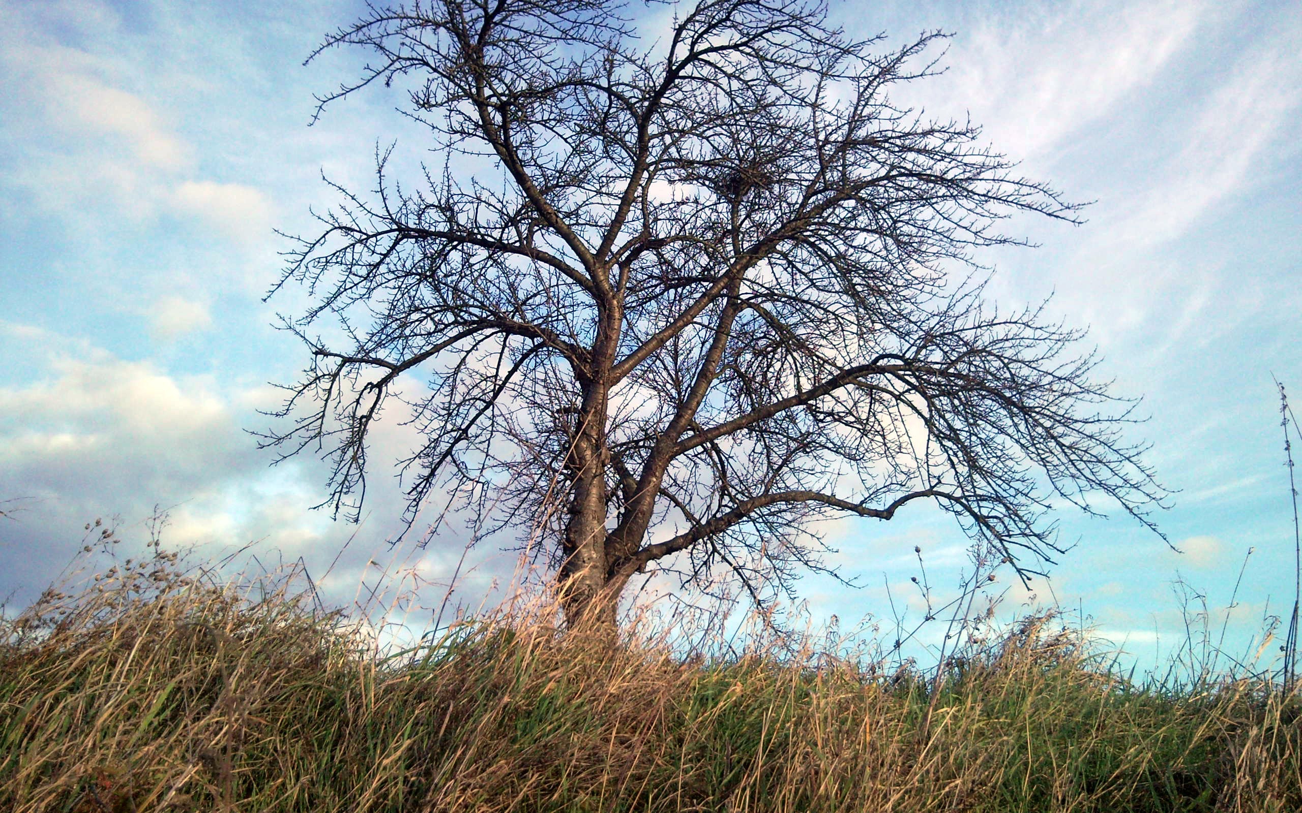 Description: A bare tree in a field with a blue sky in the background and clouds in the sky above it.