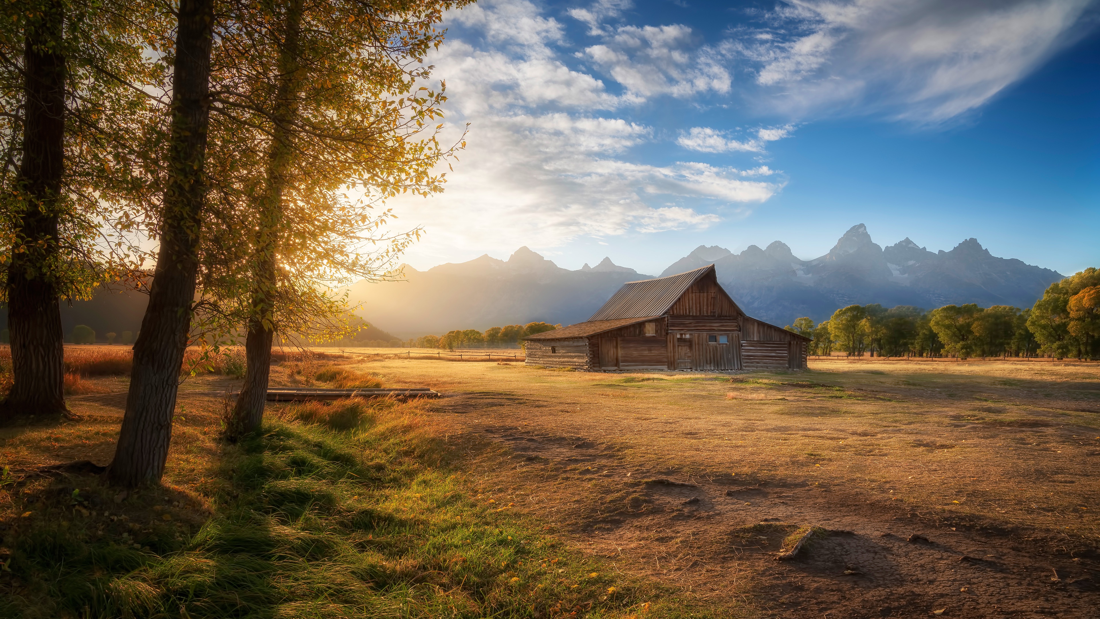 Description: A barn in a field with mountains in the background and a blue sky with clouds above it and a few trees.