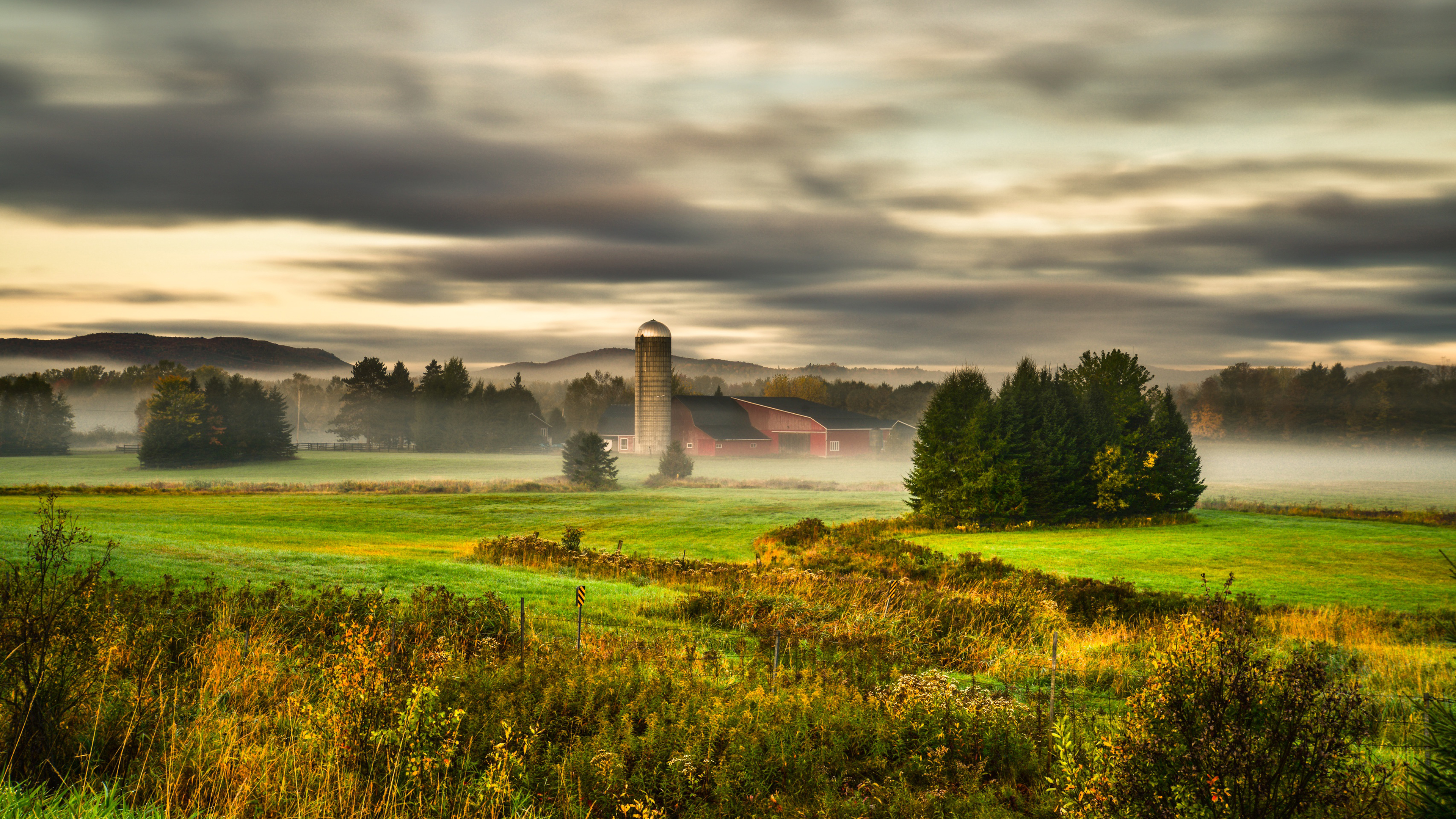 Description: A barn in a field with a foggy sky in the background and trees in the foreground.