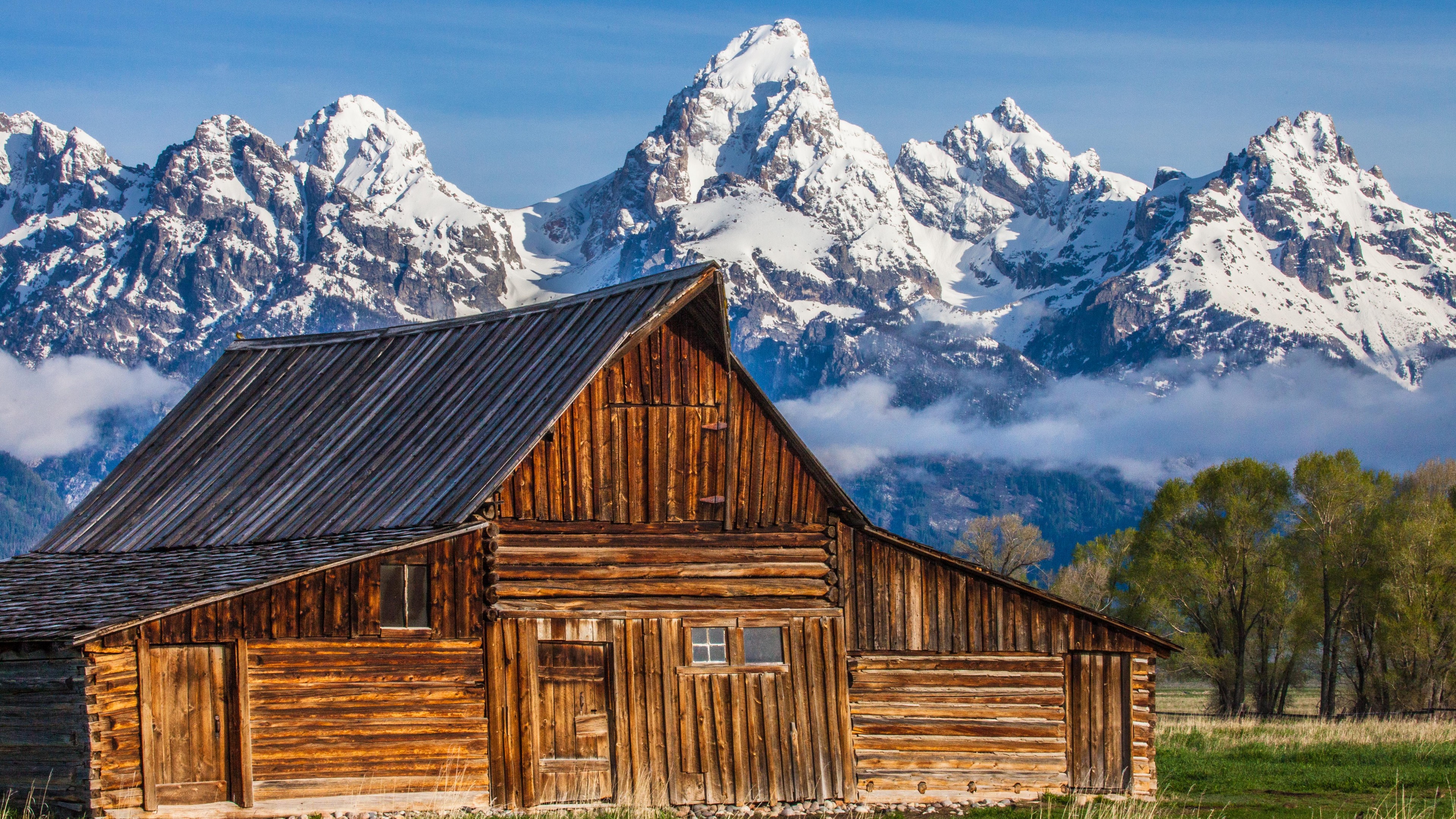 Description: A barn in front of a mountain range with a sky background and clouds in the foreground.