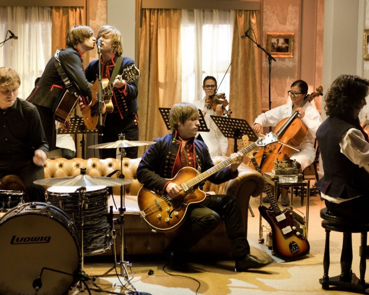 Description: A group of people playing instruments in a room with a couch and a piano in the background and a man in a suit and tie.