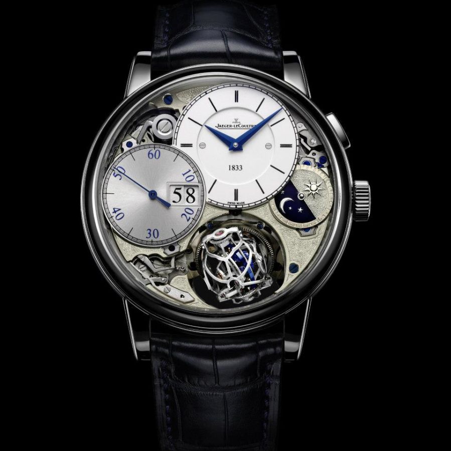 Description: A watch with a white dial and blue hands on a black background with a blue second hand and a white second hand.