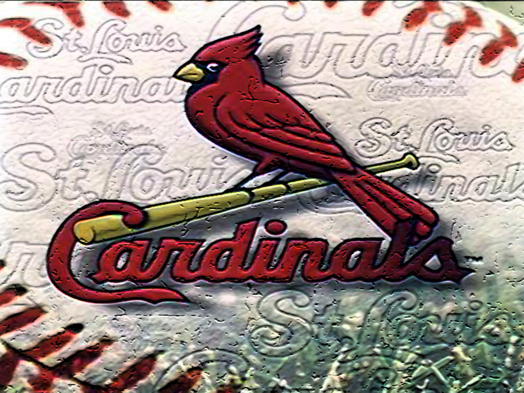 Description: A close up of a baseball with a cardinal on it's bat and a baseball field in the background.