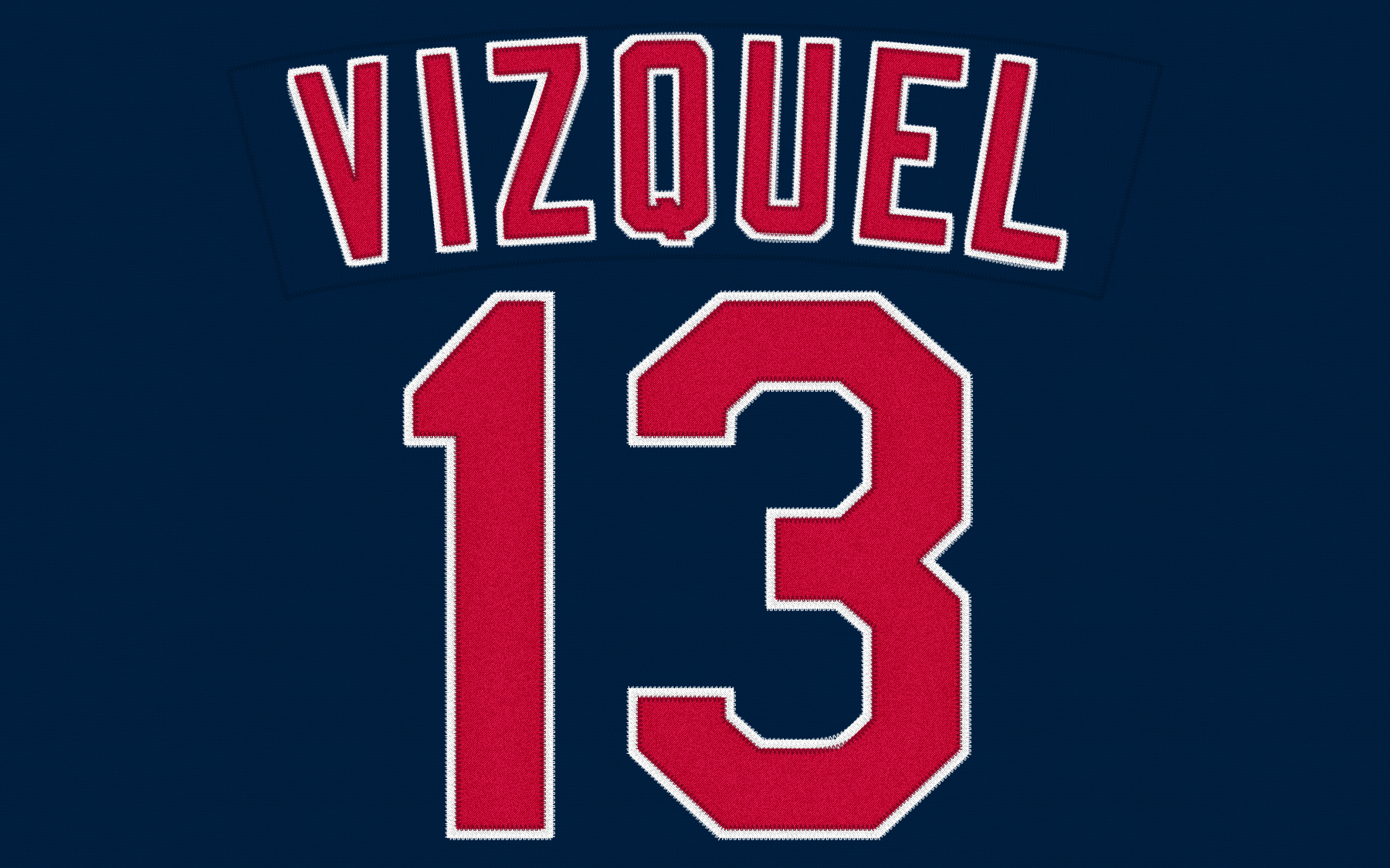 Description: A baseball jersey with the number 13 on it and the name of the team in red and blue colors.