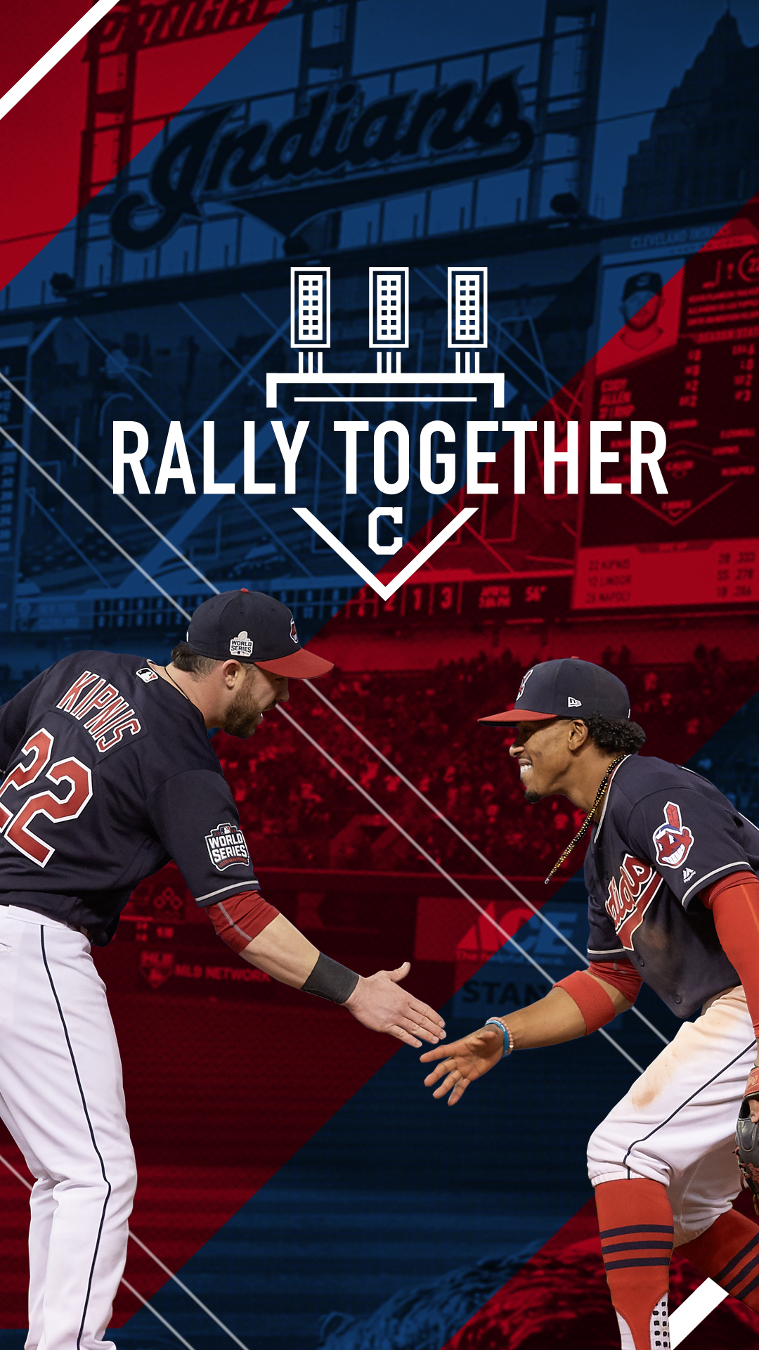 Description: A couple of baseball players shaking hands in front of a stadium sign with the words rally together on it.