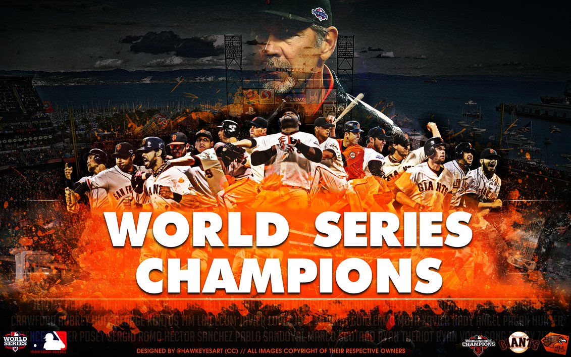 Description: A poster of a baseball team with a man in the middle of the picture and words world series champs.