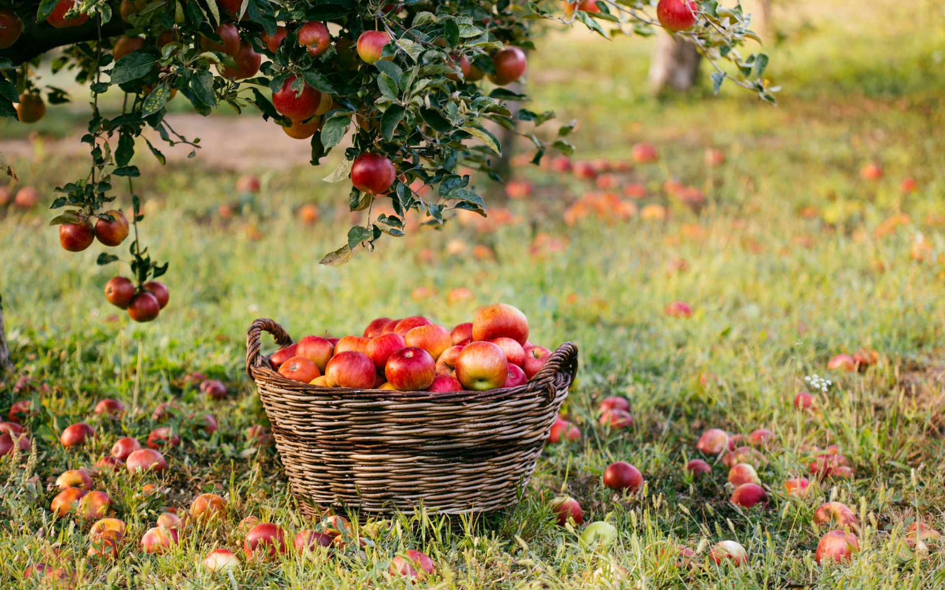 Description: A basket of apples sitting in the grass under a tree in a field of apples in the background.