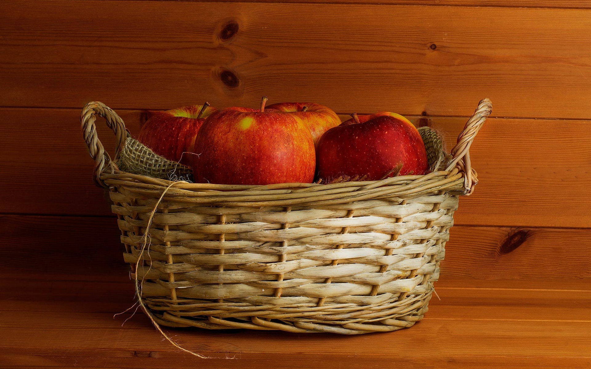 Description: A basket of apples sitting on a wooden table next to a wall with a wooden paneled wall behind it.