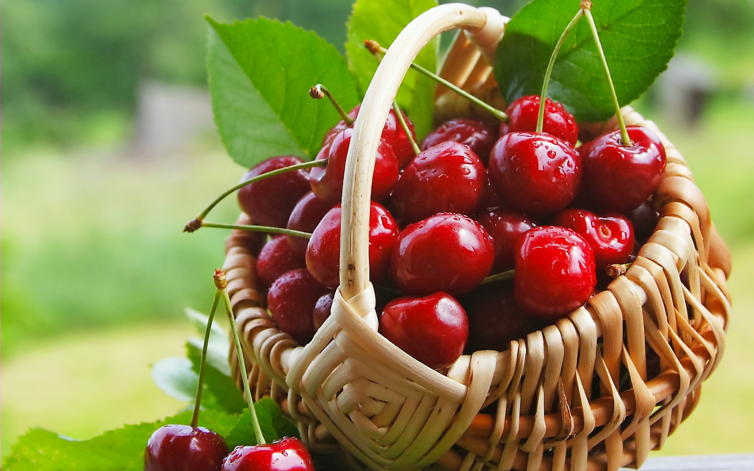 Description: A basket of cherries sitting on a table next to a leafy green background with a white basket.