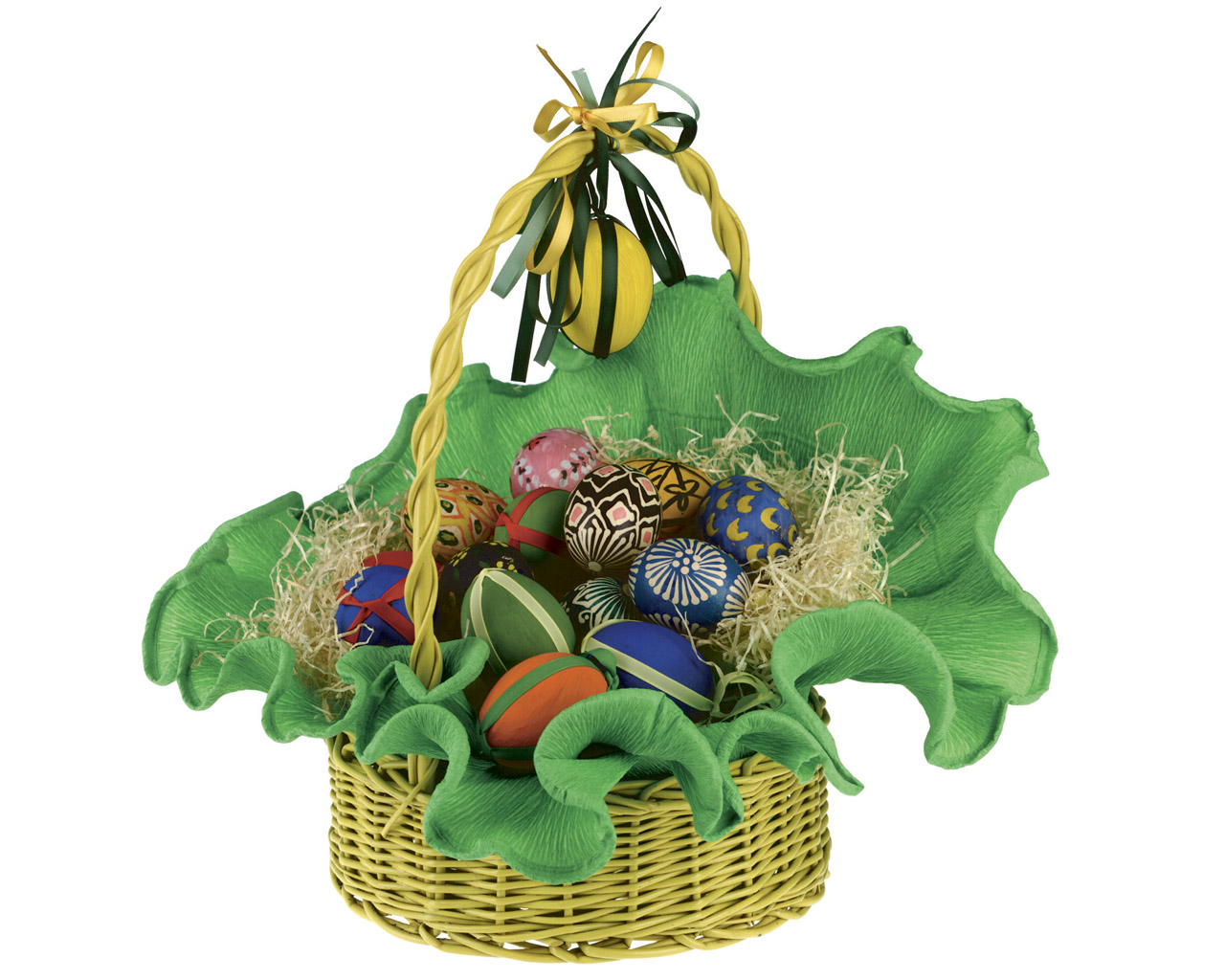 Description: A basket filled with lots of different colored eggs in it's handle and a ribbon tied around the top.