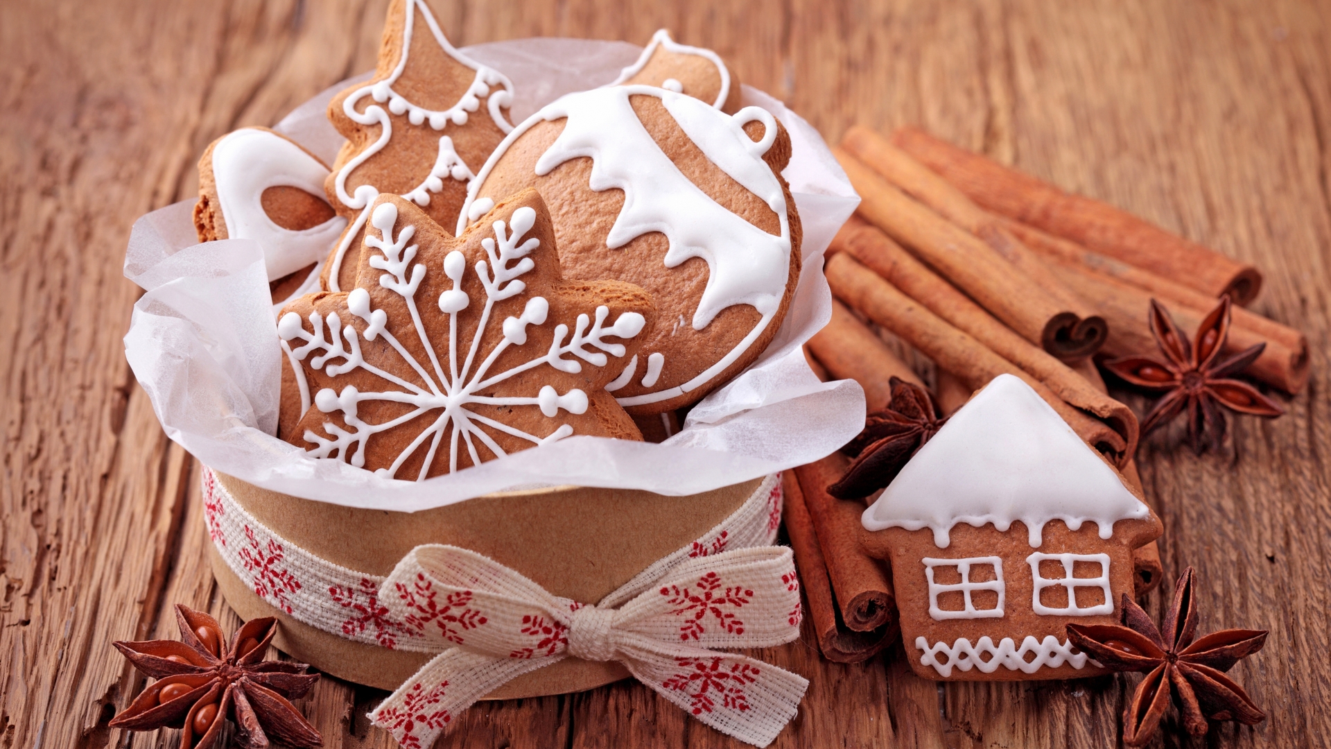 Description: A basket of cookies and cinnamon sticks on a table with cinnamon sticks and cinnamon sticks in the background and a gingerbread house.