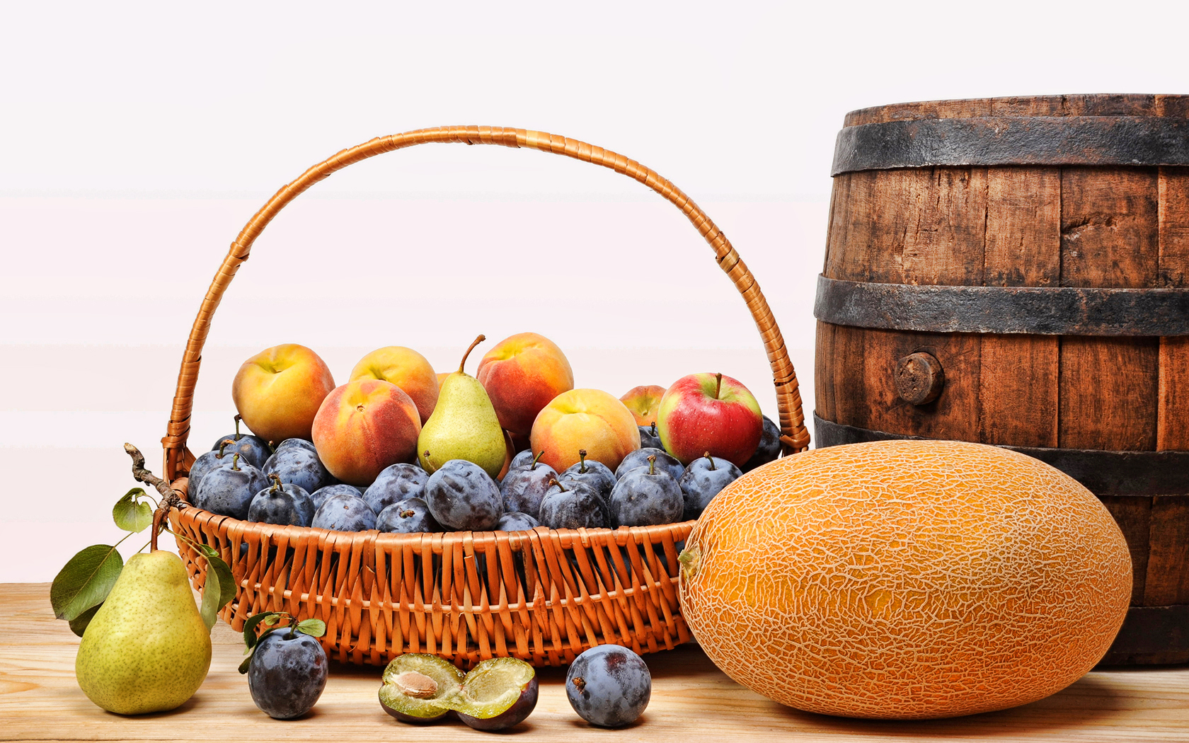 Description: A basket of fruit next to a barrel of wine and a pear and orange on a table with a barrel of wine.