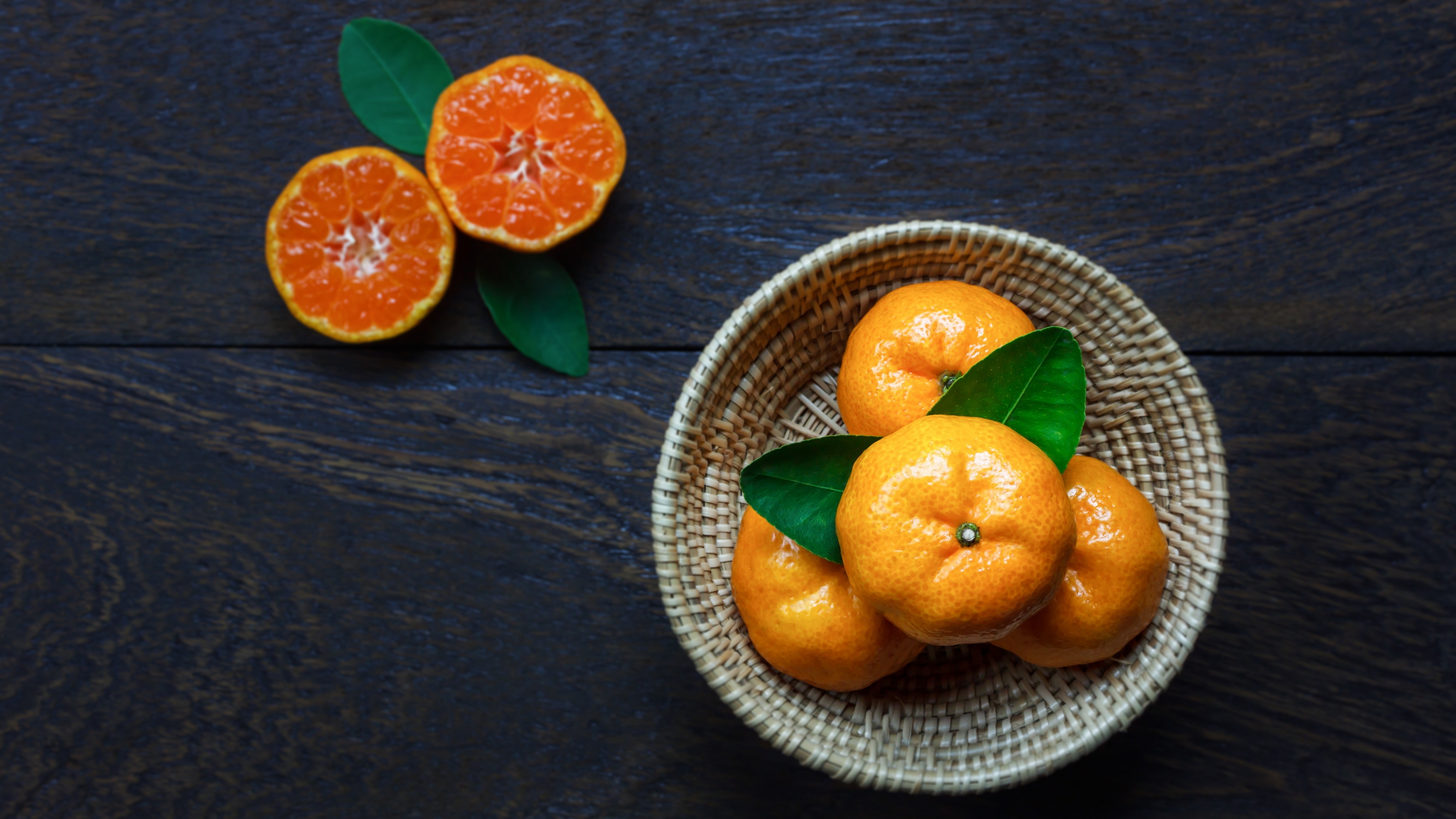 Description: A basket of oranges with leaves on a table top with a few slices of the fruit in it.