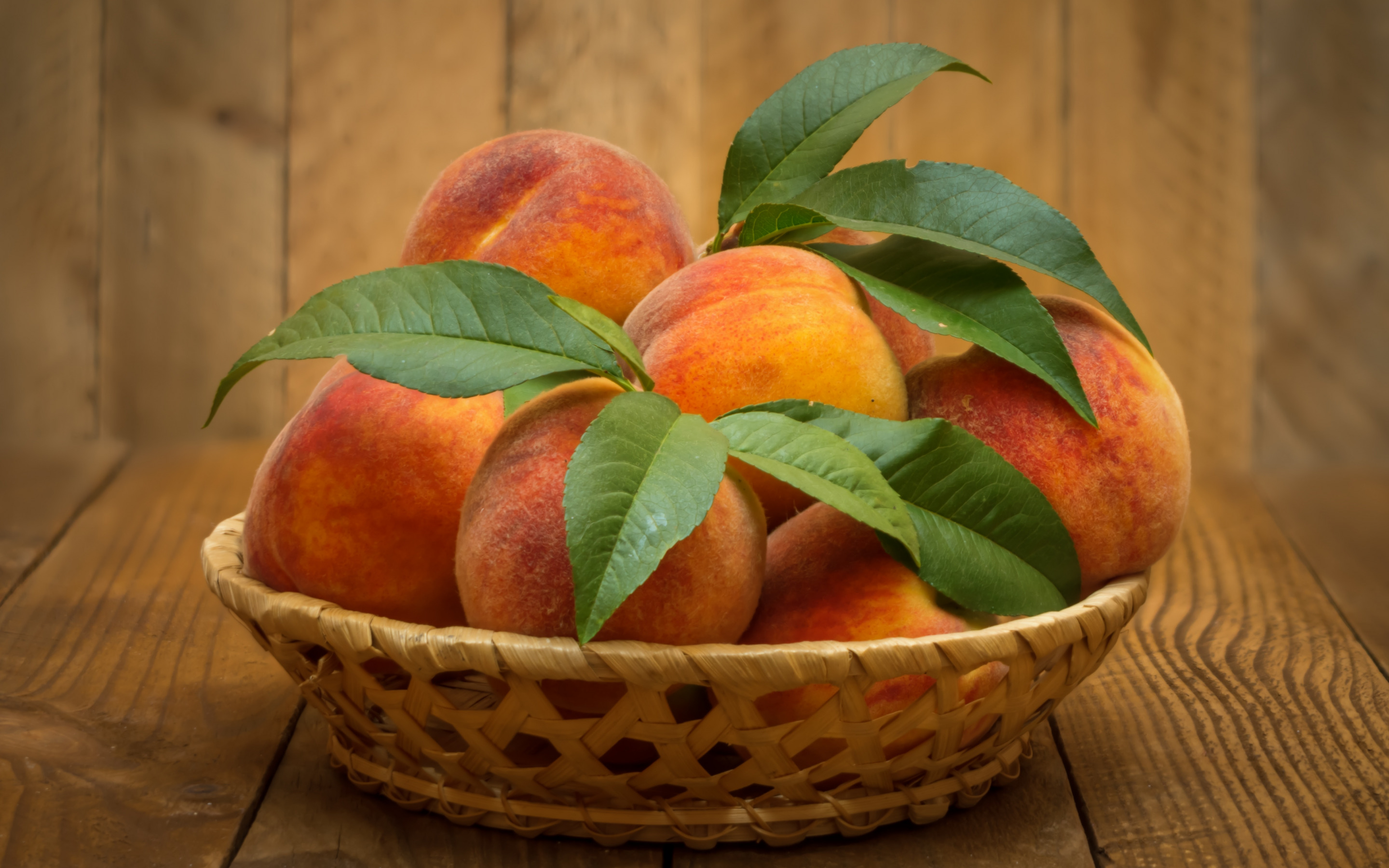 Description: A basket of peaches with leaves on a wooden table top with a wood background and a wooden wall.