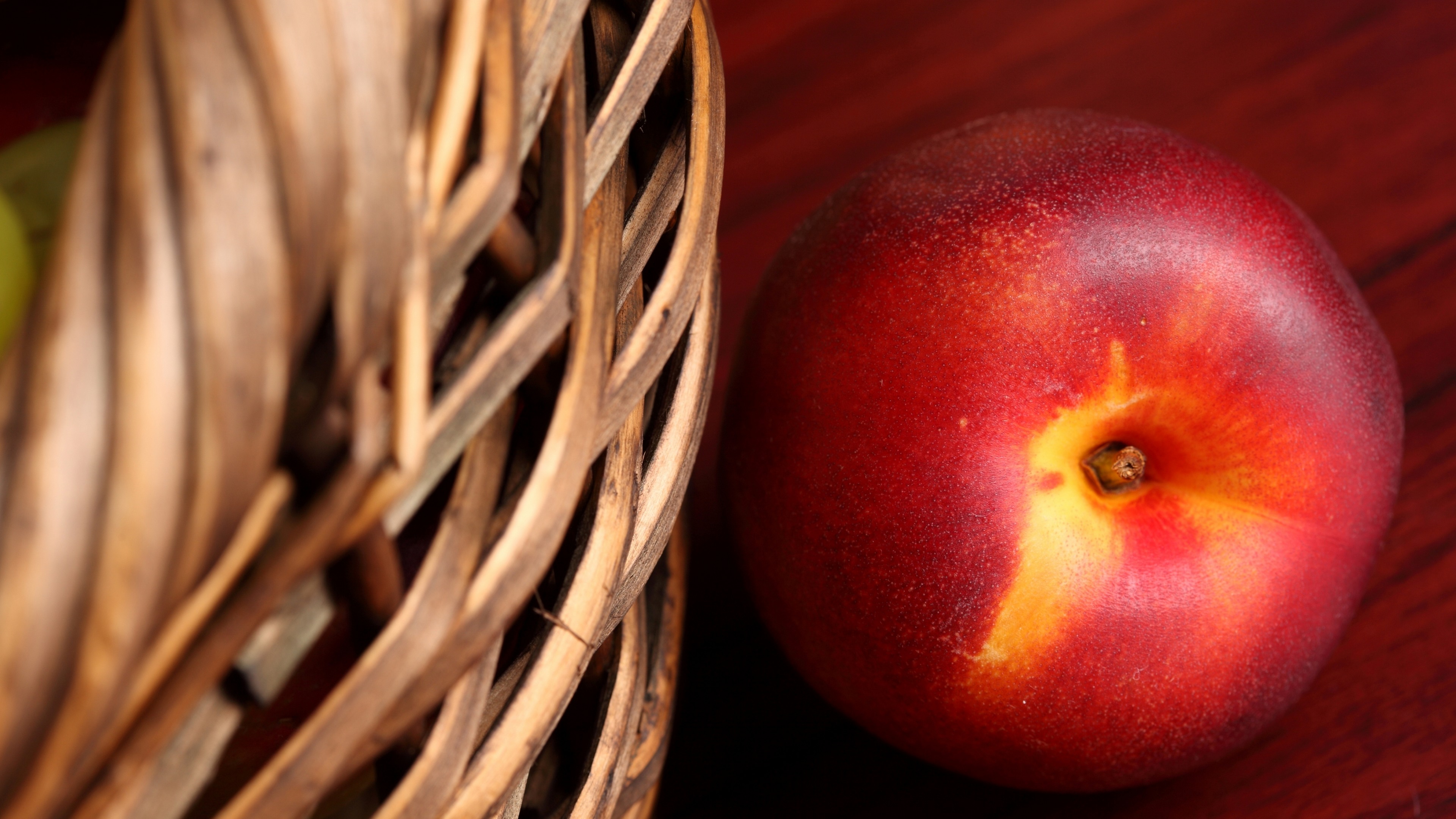 Description: A basket with a red apple next to it on a table with a green apple in it and a red apple in the background.