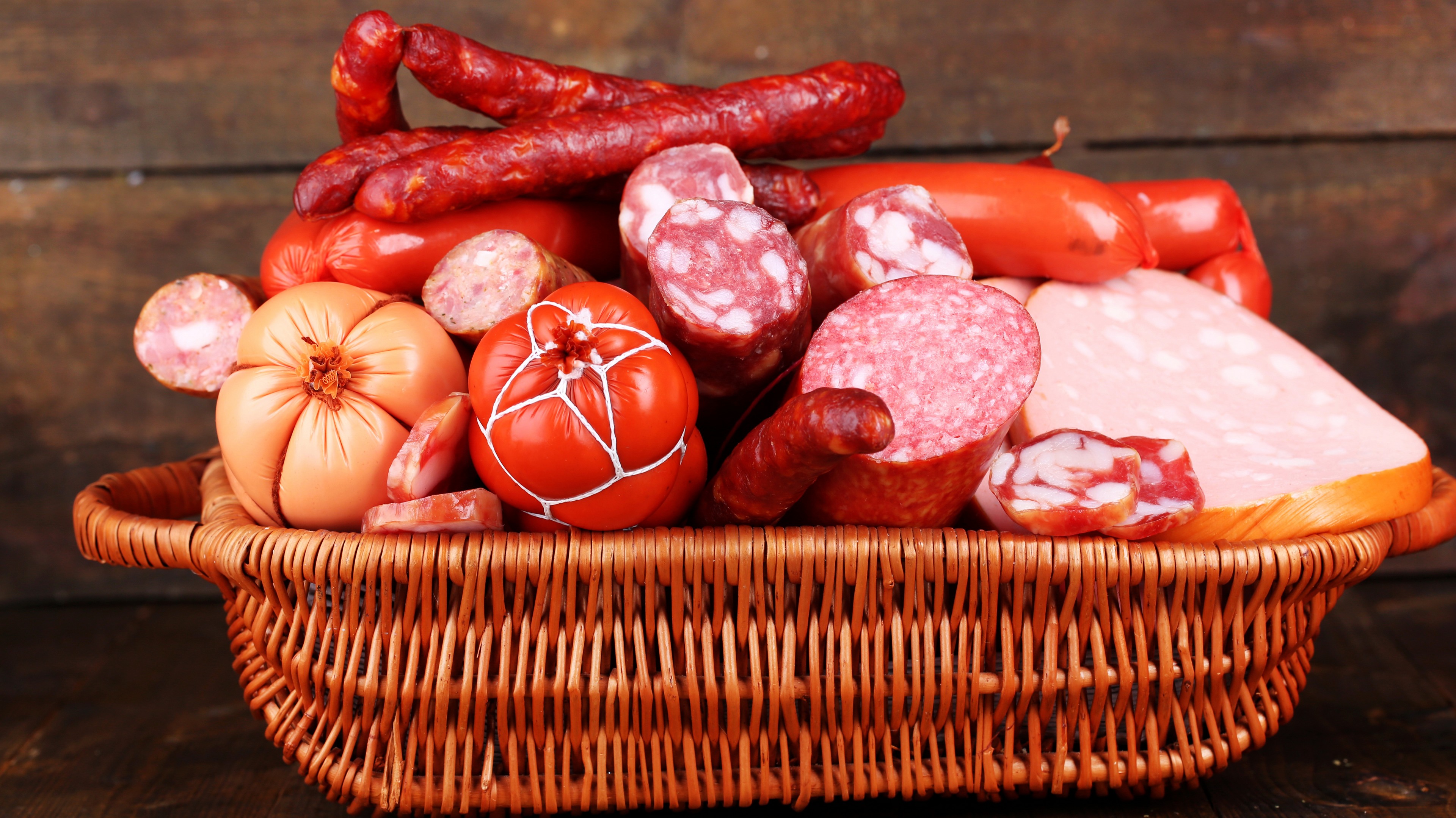 Description: A basket of sausages and tomatoes on a table top with a wooden background and a wooden wall behind it.