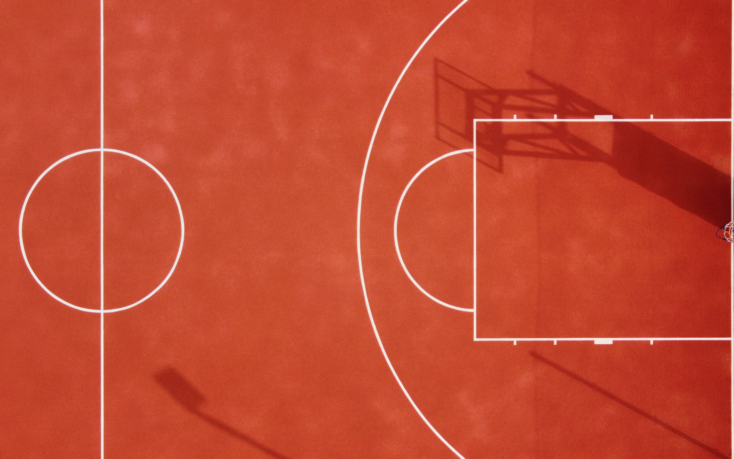 Description: A basketball court with a basketball hoop on it and a basketball in the air above it.