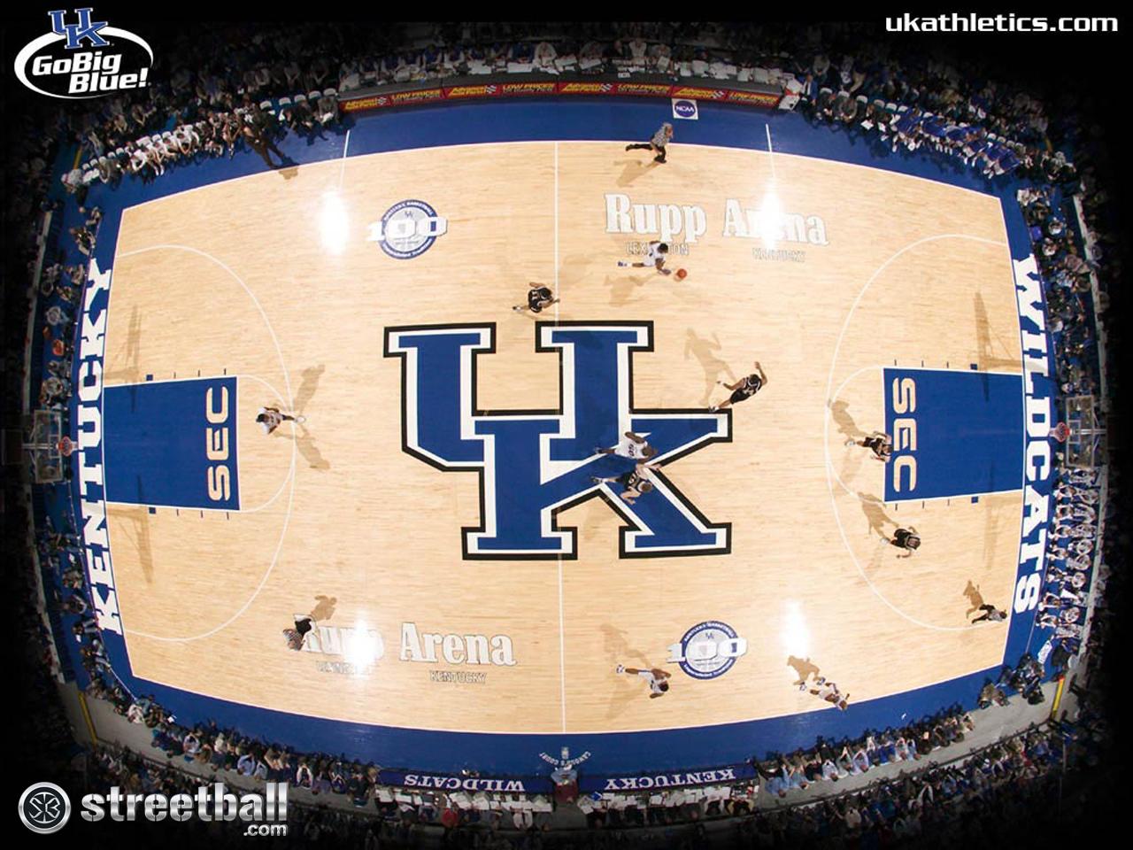 Description: A basketball court with a large kentucky logo on it and a basketball court with a basketball on it and a basketball on the floor.