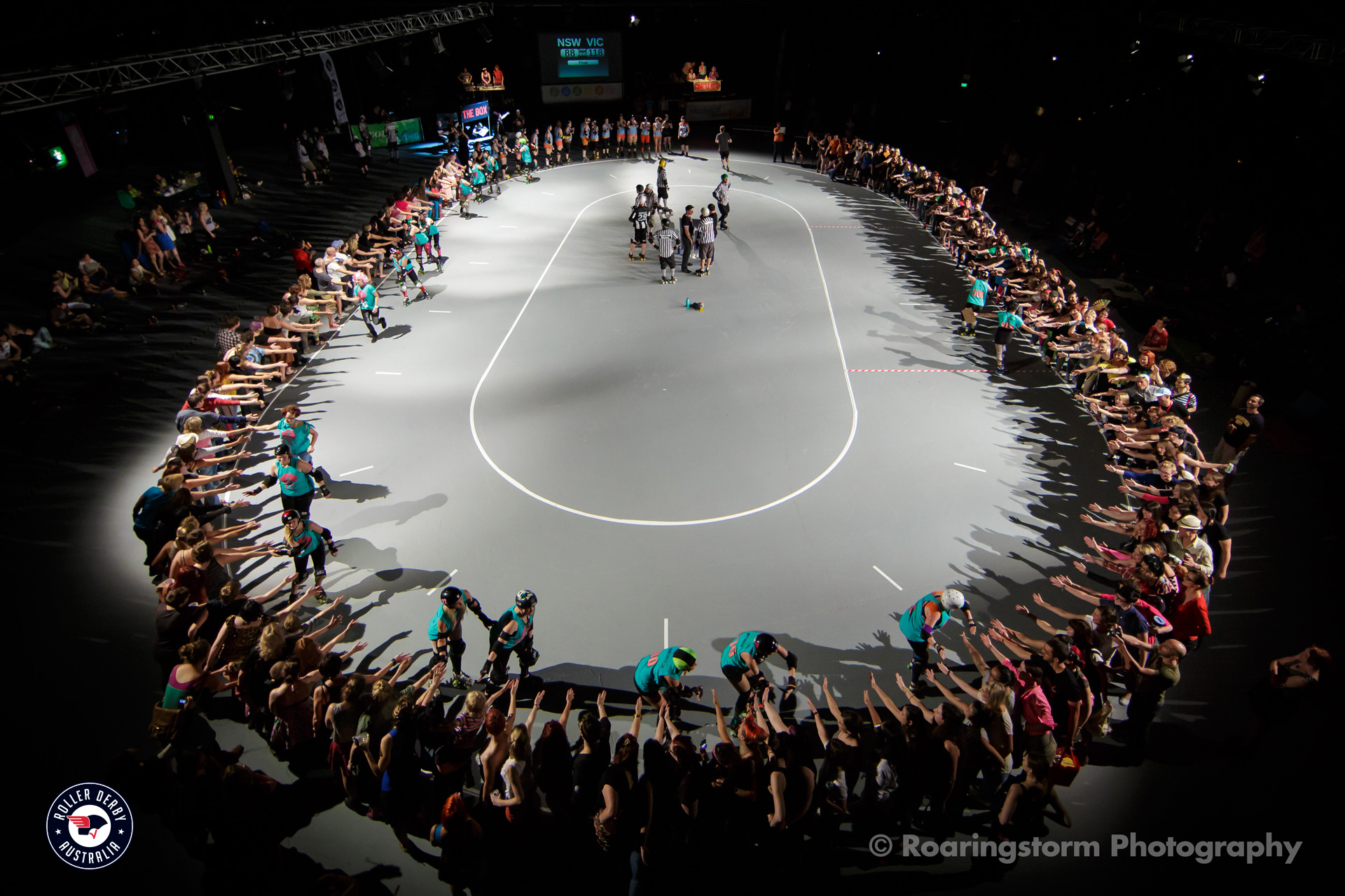 Description: A group of people standing around a basketball court in the dark with a crowd of people watching them from the stands.